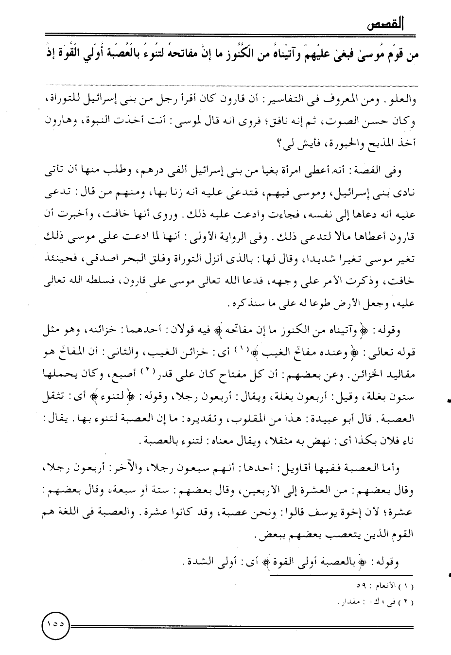 {من قوم مُوسَى فبغى عَلَيْهِم وَآتَيْنَاهُ من الْكُنُوز مَا إِن مفاتحه لتنوء بالعصبة أولي الْقُوَّة إِذْ} والعلو. وَمن الْمَعْرُوف فِي التفاسير: أَن قَارون كَانَ أَقرَأ رجل من بني إِسْرَائِيل للتوراة، وَكَانَ حسن الصَّوْت، ثمَّ إِنَّه نَافق؛ فروى أَنه قَالَ لمُوسَى: أَنْت أخذت النُّبُوَّة، وَهَارُون أَخذ المذبح والحبورة، فأيش لي؟