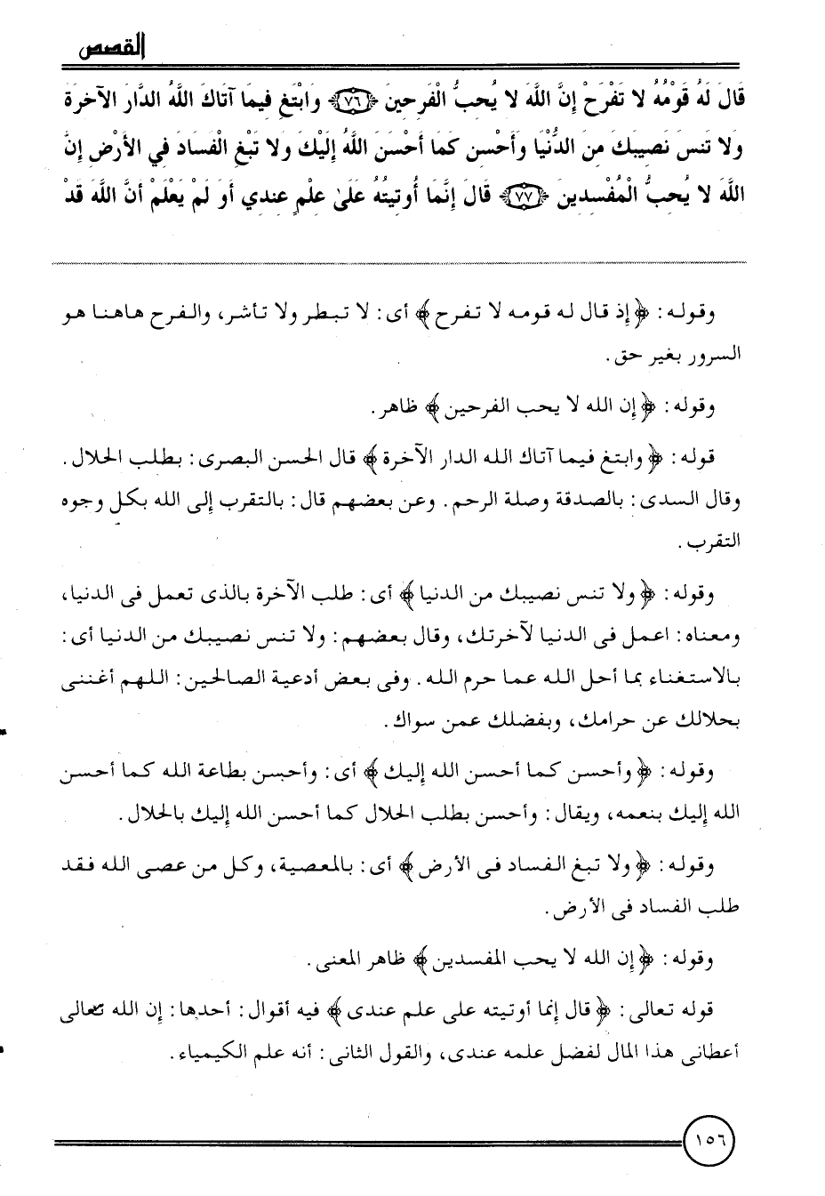 {قَالَ لَهُ قومه لَا تفرح إِن الله لَا يحب الفرحين (76) وابتغ فِيمَا آتاك الله الدَّار الْآخِرَة وَلَا تنس نصيبك من الدُّنْيَا وَأحسن كَمَا أحسن الله إِلَيْك وَلَا تَبْغِ الْفساد فِي الأَرْض إِن الله لَا يحب المفسدين (77) قَالَ إِنَّمَا أُوتِيتهُ على علم عِنْدِي أَو لم يعلم أَن الله قد}