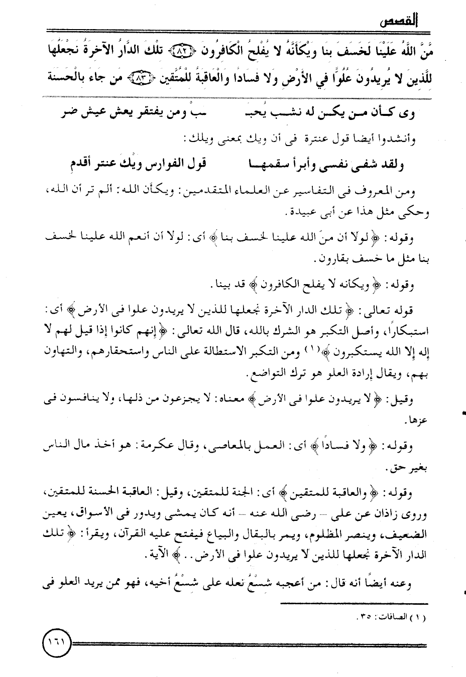 قَوْله تَعَالَى: {تِلْكَ الدَّار الْآخِرَة نَجْعَلهَا للَّذين لَا يُرِيدُونَ علوا فِي الأَرْض} أَي: استكبارا، وأصل التكبر هُوَ الشّرك بِاللَّه، قَالَ الله تَعَالَى: {إِنَّهُم كَانُوا إِذا قيل لَهُم لَا إِلَه إِلَّا الله يَسْتَكْبِرُونَ} وَمن التكبر الاستطالة على النَّاس واستحقارهم، والتهاون بهم، وَيُقَال إِرَادَة الْعُلُوّ هُوَ ترك التَّوَاضُع.