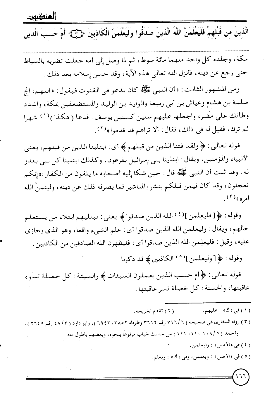 {الَّذين من قبلهم فليعلمن الله الَّذين صدقُوا وليعلمن الْكَاذِبين (3) أم حسب الَّذين} مَكَّة، وَجلده كل وَاحِد مِنْهُمَا مائَة سَوط، ثمَّ لما وصل إِلَى أمه جعلت تضربه بالسياط حَتَّى رَجَعَ عَن دينه، فَأنْزل الله تَعَالَى هَذِه الْآيَة، وَقد حسن إِسْلَامه بعد ذَلِك.