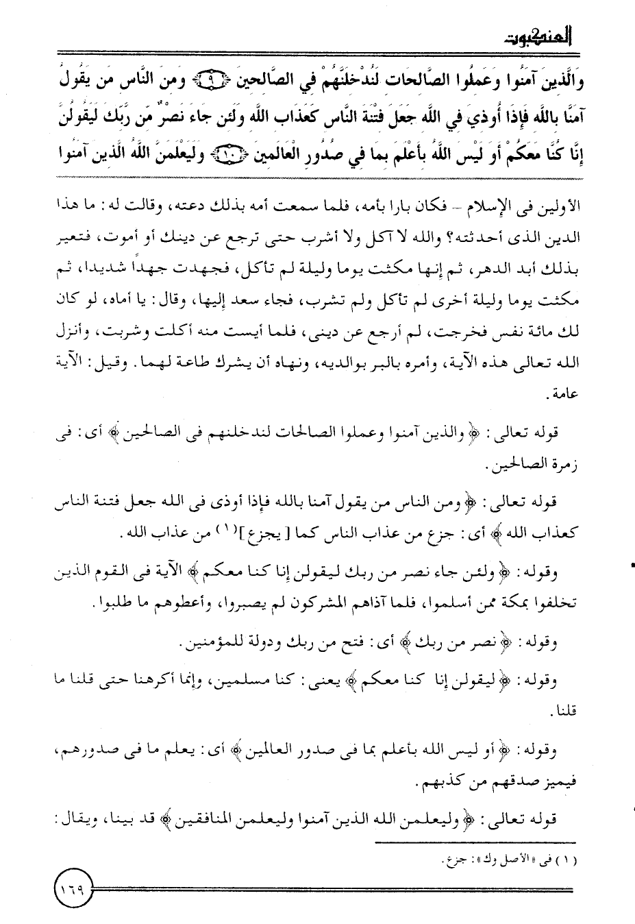 {وَالَّذين آمنُوا وَعمِلُوا الصَّالِحَات لندخلنهم فِي الصَّالِحين (9) وَمن النَّاس من يَقُول آمنا بِاللَّه فَإِذا أوذي فِي الله جعل فتْنَة النَّاس كعذاب الله وَلَئِن جَاءَ نصر من رَبك ليَقُولن إِنَّا كُنَّا مَعكُمْ أَو لَيْسَ الله بِأَعْلَم بِمَا فِي صُدُور الْعَالمين (10) وليعلمن الله الَّذين آمنُوا} الْأَوَّلين فِي الْإِسْلَام - فَكَانَ بارا بِأُمِّهِ، فَلَمَّا سَمِعت أمه بذلك دَعَتْهُ، وَقَالَت لَهُ: مَا هَذَا الدّين الَّذِي أحدثته؟ وَالله لَا آكل وَلَا أشْرب حَتَّى ترجع عَن دينك أَو أَمُوت، فتعير بذلك أَبَد الدَّهْر، ثمَّ إِنَّهَا مكثت يَوْمًا وَلَيْلَة لم تَأْكُل، فجهدت جهدا شَدِيدا، ثمَّ مكثت يَوْمًا وليله أُخْرَى لم تَأْكُل وَلم تشرب، فجَاء سعد إِلَيْهَا، وَقَالَ: يَا أُمَّاهُ، لَو كَانَ لَك مائَة نفس فَخرجت، لم أرجع عَن ديني، فَلَمَّا أَيِست مِنْهُ أكلت وشربت، وَأنزل الله تَعَالَى هَذِه الْآيَة، وَأمره بِالْبرِّ بِوَالِديهِ، وَنَهَاهُ أَن يُشْرك طَاعَة لَهما. وَقيل: الْآيَة عَامَّة.