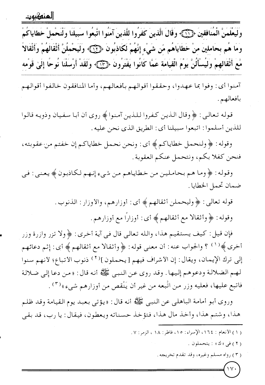 فَإِن قيل: كَيفَ يَسْتَقِيم هَذَا، وَالله تَعَالَى قَالَ فِي آيَة أُخْرَى: {وَلَا تزر وَازِرَة وزر أُخْرَى} ؟ وَالْجَوَاب عَنهُ: أَن معنى قَوْله: {وأثقالا مَعَ أثقالهم} أَي: إِثْم دُعَائِهِمْ إِلَى ترك الْإِيمَان، وَيُقَال: إِن الْأَشْرَاف فيهم [يحملون] ذنُوب الأتباع؛ لأَنهم سنوا لَهُم الضَّلَالَة ودعوهم إِلَيْهَا. وَقد روى عَن النَّبِي أَنه قَالَ: " من دَعَا إِلَى ضَلَالَة فَاتبع عَلَيْهَا، فَعَلَيهِ وزر من اتبعهُ من غير أَن ينقص من أوزارهم شئ ".