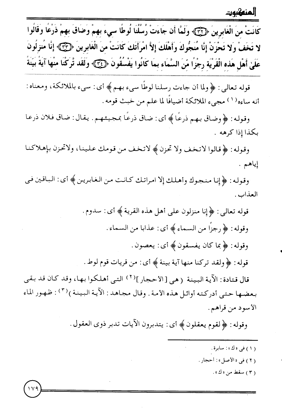{كَانَت من الغابرين (32) وَلما أَن جَاءَت رسلنَا لوطا سيء بهم وضاق بهم ذرعا وَقَالُوا لَا تخف وَلَا تحزن إِنَّا منجوك وَأهْلك إِلَّا امْرَأَتك كَانَت من الغابرين (33) إِنَّا منزلون على أهل هَذِه الْقرْيَة رجزا من السَّمَاء بِمَا كَانُوا يفسقون (34) وَلَقَد تركنَا مِنْهَا آيَة بَيِّنَة}