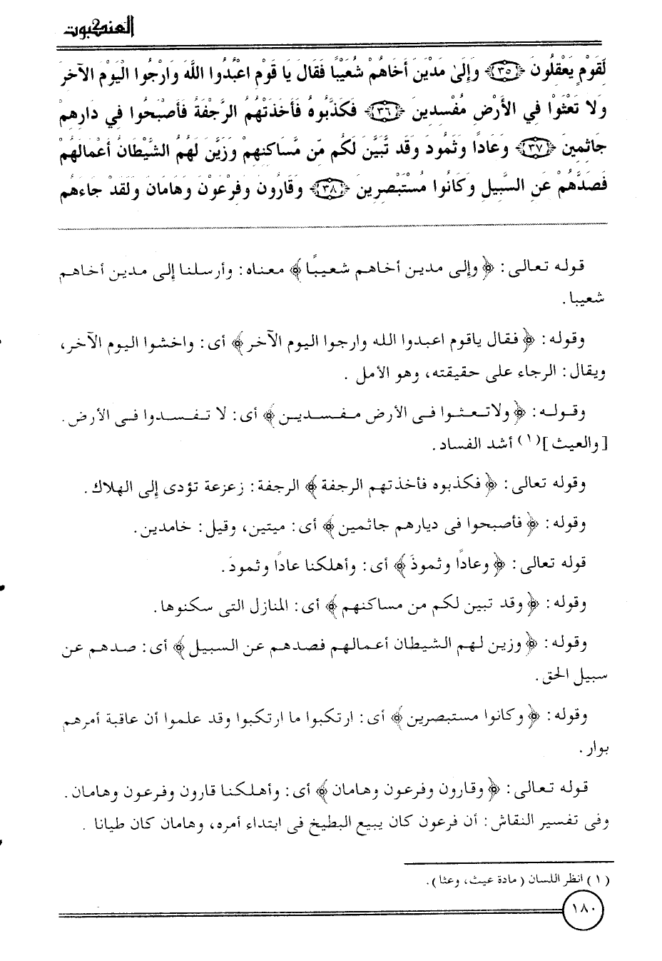 {لقوم يعْقلُونَ (35) وَإِلَى مَدين أَخَاهُم شعيبا فَقَالَ يَا قوم اعبدوا الله وارجوا الْيَوْم الآخر وَلَا تعثوا فِي الأَرْض مفسدين (36) فَكَذبُوهُ فَأَخَذتهم الرجفة فَأَصْبحُوا فِي دَارهم جاثمين (37) وعادا وَثَمُود وَقد تبين لكم من مساكنهم وزين لَهُم الشَّيْطَان أَعْمَالهم فصدهم عَن السَّبِيل وَكَانُوا مستبصرين (38) وَقَارُون وَفرْعَوْن وهامان وَلَقَد جَاءَهُم}
