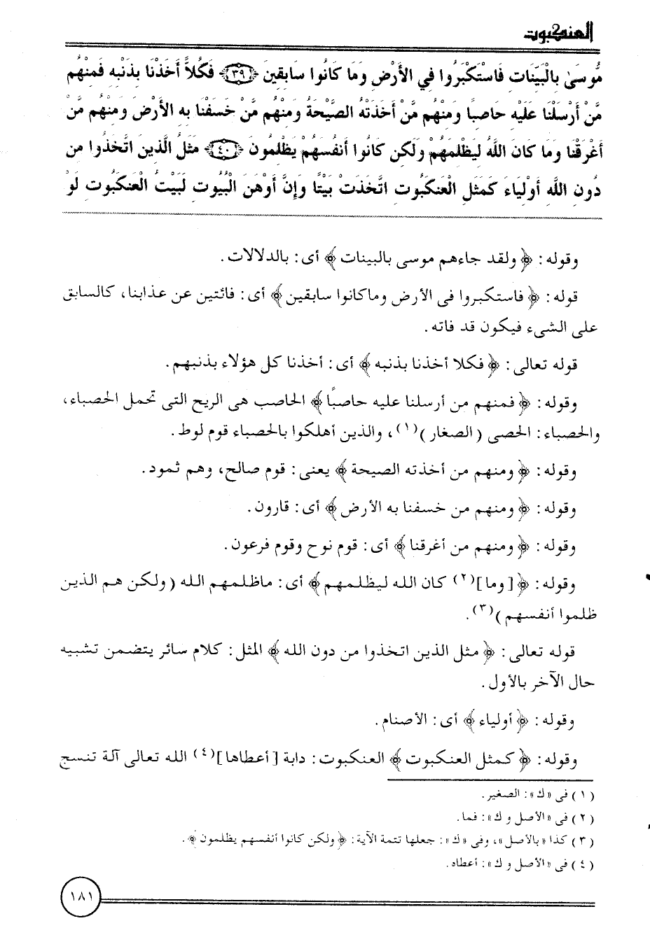 {مُوسَى بِالْبَيِّنَاتِ فاستكبروا فِي الأَرْض وَمَا كَانُوا سابقين (39) فكلا أَخذنَا بِذَنبِهِ فَمنهمْ من أرسلنَا عَلَيْهِ حاصبا وَمِنْهُم من أَخَذته الصَّيْحَة وَمِنْهُم من خسفنا بِهِ الأَرْض وَمِنْهُم من أغرقنا وَمَا كَانَ الله ليظلمهم وَلَكِن كَانُوا أنفسهم يظْلمُونَ (40) مثل الَّذين اتَّخذُوا من دون الله أَوْلِيَاء كَمثل العنكبوت اتَّخذت بَيْتا وَإِن أوهن الْبيُوت لبيت العنكبوت لَو}