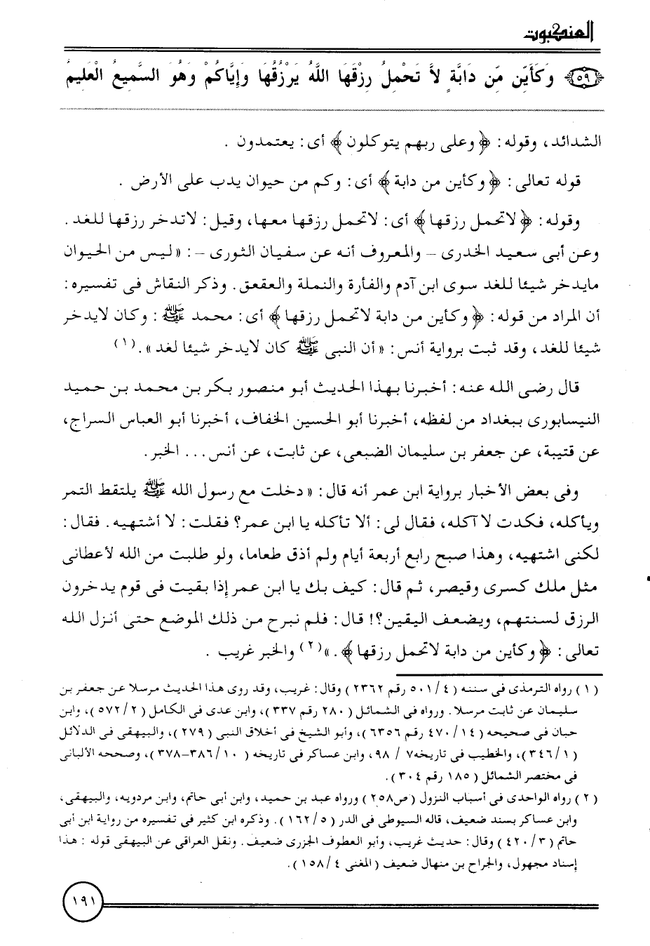 وَعَن أبي سعيد الْخُدْرِيّ وَالْمَعْرُوف أَنه عَن سُفْيَان الثَّوْريّ: " لَيْسَ من الْحَيَوَان مَا يدّخر شَيْئا للغد سوى ابْن آدم والفأرة والنملة والعقعق. وَذكر النقاش فِي تَفْسِيره: أَن المُرَاد من قَوْله: {وكأين من دَابَّة لَا تحمل رزقها} أَي: مُحَمَّد: وَكَانَ لَا يدّخر شَيْئا للغد، وَقد ثَبت بِرِوَايَة أنس: " أَن النَّبِي كَانَ لَا يدّخر شَيْئا لغد ".