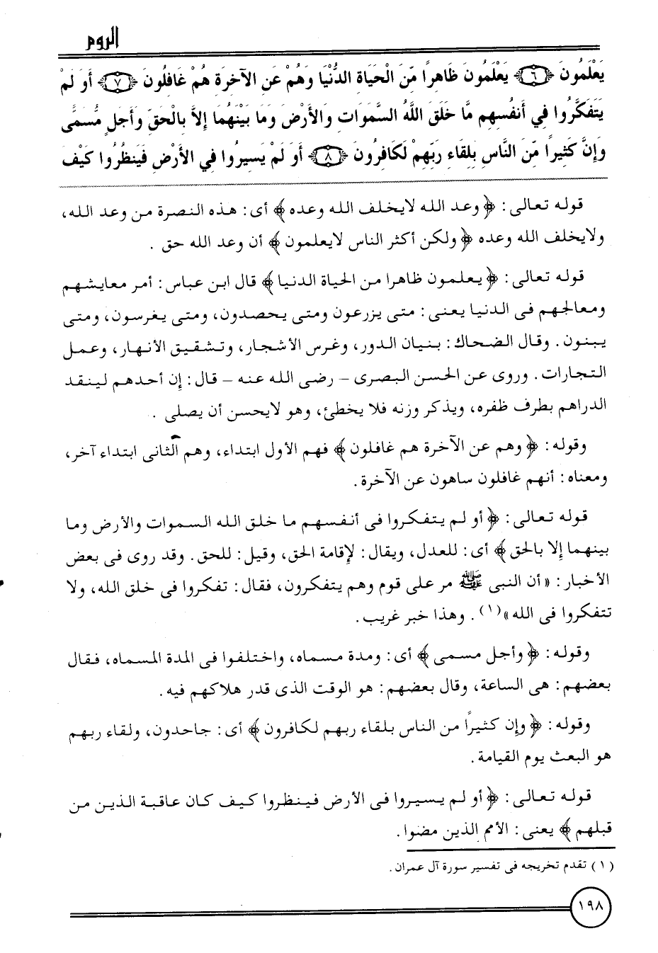 {يعلمُونَ (6) يعلمُونَ ظَاهرا من الْحَيَاة الدُّنْيَا وهم عَن الْآخِرَة هم غافلون (7) أَو لم يتفكروا فِي أنفسهم مَا خلق الله السَّمَوَات وَالْأَرْض وَمَا بَينهمَا إِلَّا بِالْحَقِّ وَأجل مُسَمّى وَإِن كثيرا من النَّاس بلقاء رَبهم لكافرون (8) أَو لم يَسِيرُوا فِي الأَرْض فينظروا كَيفَ}