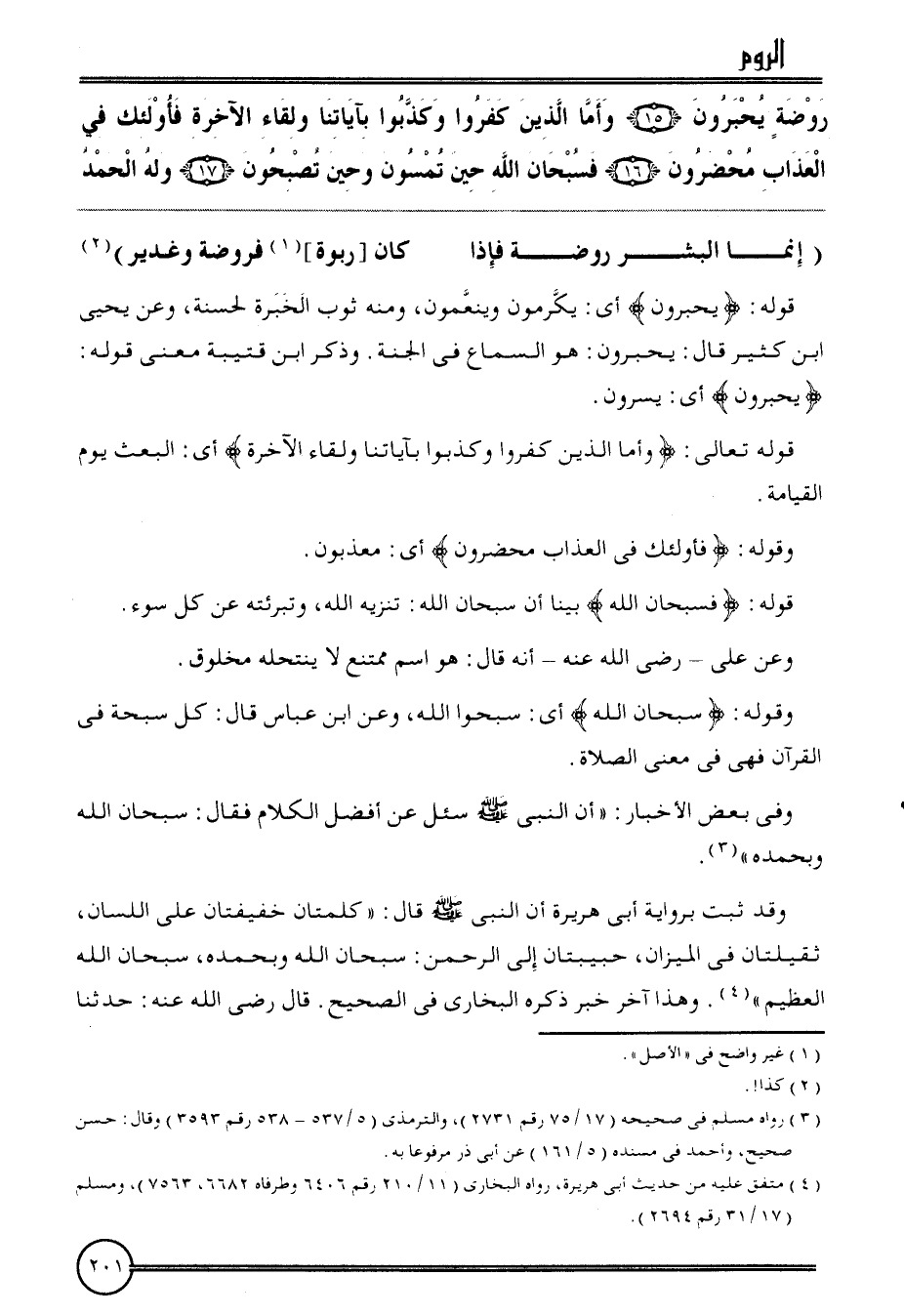 {رَوْضَة يحبرون (15) وَأما الَّذين كفرُوا وكذبوا بِآيَاتِنَا ولقاء الْآخِرَة فَأُولَئِك فِي الْعَذَاب محضرون (16) فسبحان الله حِين تمسون وَحين تُصبحُونَ (17) وَله الْحَمد}