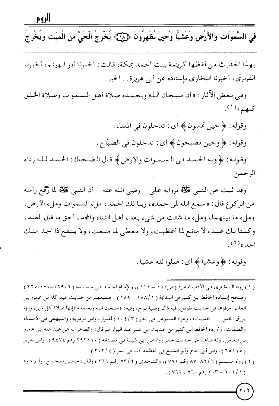 {فِي السَّمَوَات وَالْأَرْض وعشيا وَحين تظْهرُونَ (18) يخرج الْحَيّ من الْمَيِّت وَيخرج} بِهَذَا الحَدِيث من لَفظهَا كَرِيمَة بنت أَحْمد بِمَكَّة، قَالَت: أخبرنَا أَبُو الْهَيْثَم، أخبرنَا الْفربرِي، أخبرنَا البُخَارِيّ بِإِسْنَادِهِ عَن أبي هُرَيْرَة. . الْخَبَر.