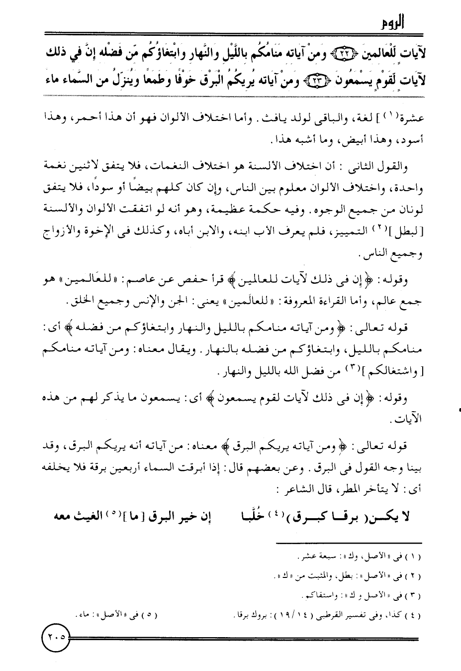 {لآيَات للْعَالمين (22) وَمن آيَاته منامكم بِاللَّيْلِ وَالنَّهَار وابتغاؤكم من فَضله إِن فِي ذَلِك لآيَات لقوم يسمعُونَ (23) وَمن آيَاته يريكم الْبَرْق خوفًا وَطَمَعًا وَينزل من السَّمَاء مَاء} عشرَة] لُغَة، وَالْبَاقِي لولد يافث. وَأما اخْتِلَاف الألوان فَهُوَ أَن هَذَا أَحْمَر، وَهَذَا أسود، وَهَذَا أَبيض، مَا أشبه هَذَا.