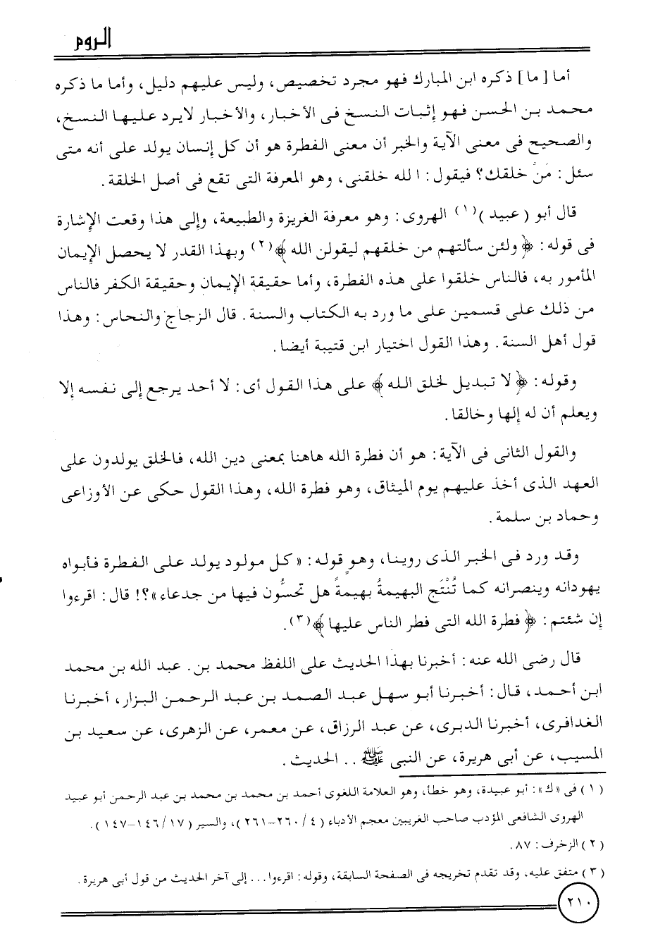 أما [مَا] ذكره ابْن الْمُبَارك فَهُوَ مُجَرّد تَخْصِيص، وَلَيْسَ عَلَيْهِم دَلِيل، وَأما مَا ذكره مُحَمَّد بن الْحسن فَهُوَ إِثْبَات النّسخ فِي الْأَخْبَار، وَالْأَخْبَار لَا يرد عَلَيْهَا النّسخ، وَالصَّحِيح فِي معنى الْآيَة وَالْخَبَر أَن معنى الْفطْرَة هُوَ أَن كل إِنْسَان يُولد على أَنه مَتى سُئِلَ: من خلقك؟ فَيَقُول: الله خلقني، هُوَ الْمعرفَة الَّتِي تقع فِي أصل الْخلقَة.