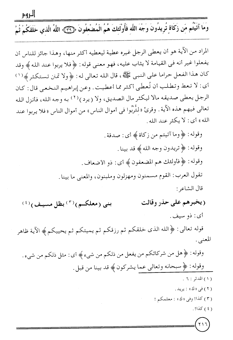 {وَمَا آتيتم من زَكَاة تُرِيدُونَ وَجه الله فَأُولَئِك هم المضعفون (39) الله الَّذِي خَلقكُم ثمَّ} المُرَاد من الْآيَة هُوَ أَن يُعْطي الرجل غَيره عَطِيَّة ليعطيه أَكثر مِنْهَا، وَهَذَا جَائِز للنَّاس أَن يَفْعَلُوا غير أَنه فِي الْقِيَامَة لَا يُثَاب عَلَيْهِ، فَهُوَ معنى قَوْله: {فَلَا يربوا عِنْد الله} وَقد كَانَ هَذَا الْفِعْل حَرَامًا على النَّبِي، قَالَ الله تَعَالَى لَهُ: {وَلَا تمنن تستكثر} أَي: لَا تعط وتطلب أَن تُعْطى أَكثر مِمَّا أَعْطَيْت. وَعَن إِبْرَاهِيم النَّخعِيّ قَالَ: كَانَ الرجل يعْطى صديقه مَالا ليكْثر مَال الصّديق، وَلَا (يرد) بِهِ وَجه الله، فَأنْزل الله تَعَالَى فيهم هَذِه الْآيَة. وَقُرِئَ " لتربوا فِي أَمْوَال النَّاس " من أَمْوَال النَّاس " فَلَا يربوا عِنْد الله " أَي: لَا يكثر عِنْد الله.