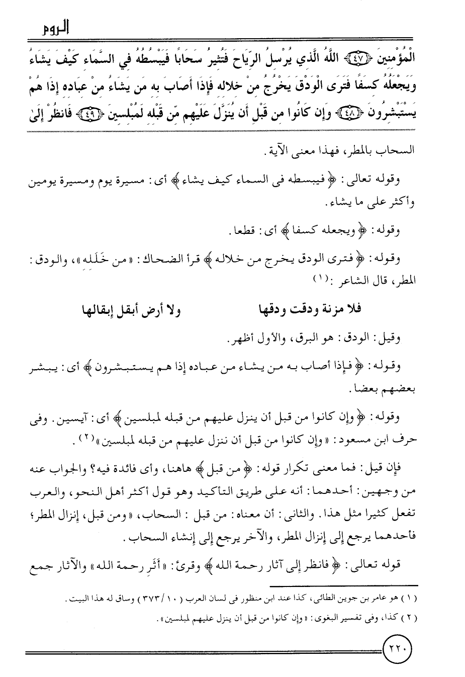 {الْمُؤمنِينَ (47) الله الَّذِي يُرْسل الرِّيَاح فتثير سحابا فيبسطه فِي السَّمَاء كَيفَ يَشَاء ويجعله كسفا فترى الودق يخرج من خلاله فَإِذا أصَاب بِهِ من يَشَاء من عباده إِذا هم يستبشرون (48) وَإِن كَانُوا من قبل أَن ينزل عَلَيْهِم من قبله لمبلسين (49) فَانْظُر إِلَى} السَّحَاب بالمطر، فَهَذَا معنى الْآيَة.