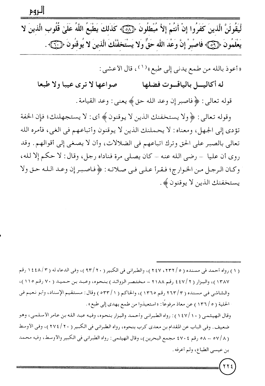 {ليَقُولن الَّذين كفرُوا إِن أَنْتُم إِلَّا مبطلون (58) كَذَلِك يطبع الله على قُلُوب الَّذين لَا يعلمُونَ (59) فاصبر إِن وعد الله حق وَلَا يستخفنك الَّذين لَا يوقنون (60) } " أعوذ بِاللَّه من طمع يدني إِلَى طبع "، قَالَ الأعشي: