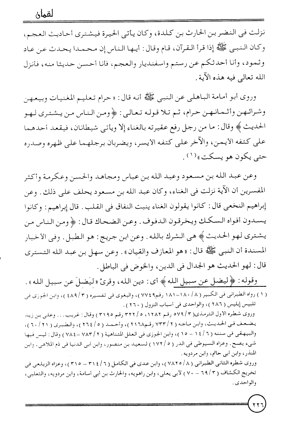 وَعَن عبد الله بن مَسْعُود وَعبد الله بن عَبَّاس وَمُجاهد وَالْحسن وَعِكْرِمَة وَأكْثر الْمُفَسّرين أَن الْآيَة نزلت فِي الْغناء، وَكَانَ عبد الله بن مَسْعُود يحلف على ذَلِك. وَعَن إِبْرَاهِيم النَّخعِيّ قَالَ: كَانُوا يَقُولُونَ الْغناء ينْبت النِّفَاق فِي الْقلب. قَالَ إِبْرَاهِيم: وَكَانُوا يسدون أَفْوَاه السكَك ويخرقون الدفوف. وَعَن الضَّحَّاك قَالَ: {وَمن النَّاس من يَشْتَرِي لَهو الحَدِيث} هِيَ الشّرك بِاللَّه. وَعَن ابْن جريج: هُوَ الطبل. وَفِي الْأَخْبَار المسندة أَن النَّبِي قَالَ: " هُوَ المعازف والقيان ". وَعَن سهل بن عبد الله التسترِي قَالَ: لَهو الحَدِيث هُوَ الْجِدَال فِي الدّين، والخوض فِي الْبَاطِل.