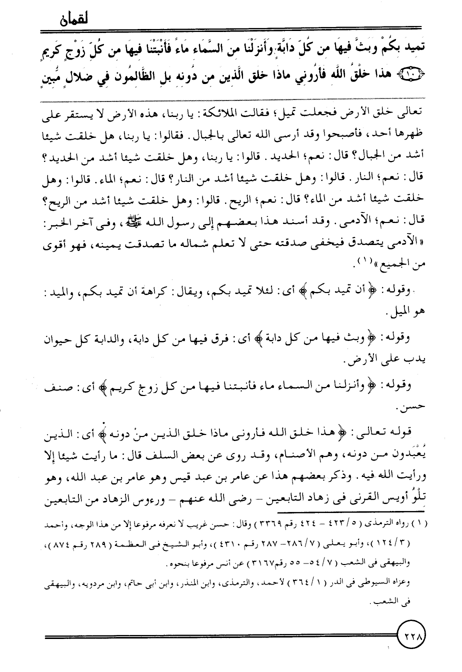 {تميد بكم وَبث فِيهَا من كل دَابَّة وأنزلنا من السَّمَاء مَاء فَأَنْبَتْنَا فِيهَا من كل زوج كريم (10) هَذَا خلق الله فأروني مَاذَا خلق الَّذين من دونه بل الظَّالِمُونَ فِي ضلال مُبين} تَعَالَى خلق الأَرْض فَجعلت تميل؛ فَقَالَت الْمَلَائِكَة: يَا رَبنَا، هَذِه الأَرْض لَا يسْتَقرّ على ظهرهَا أحد، فَأَصْبحُوا وَقد أرسى الله تَعَالَى بالجبال. فَقَالُوا: يَا رَبنَا، هَل خلقت شَيْئا أَشد من الْجبَال؟ قَالَ: نعم؛ الْحَدِيد. قَالُوا: يَا رَبنَا، وَهل خلقت شَيْئا أَشد من الْحَدِيد؟ قَالَ: نعم؛ النَّار. قَالُوا: وَهل خلقت شَيْئا أَشد من النَّار؟ قَالَ: نعم؛ المَاء. قَالُوا: وَهل خلقت شَيْئا أَشد من المَاء؟ قَالَ: نعم؛ الرّيح. قَالُوا: وَهل خلقت شَيْئا أَشد من الرّيح؟ قَالَ: نعم؛ الْآدَمِيّ. وَقد أسْند هَذَا بَعضهم إِلَى رَسُول الله، وَفِي آخر الْخَبَر: " الْآدَمِيّ يتَصَدَّق فيخفي صدقته حَتَّى لَا تعلم شِمَاله مَا تَصَدَّقت يَمِينه، فَهُوَ أقوى من الْجَمِيع ".