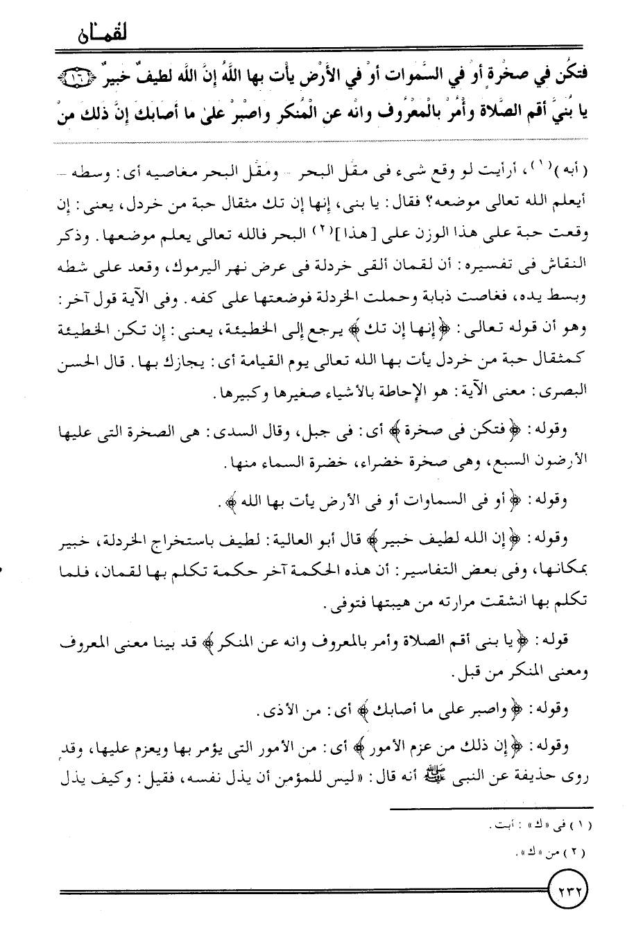{فتكن فِي صَخْرَة أَو فِي السَّمَوَات أَو فِي الأَرْض يَأْتِ بهَا الله إِن الله لطيف خَبِير (16) يَا بني أقِم الصَّلَاة وَأمر بِالْمَعْرُوفِ وانه عَن الْمُنكر واصبر على مَا أَصَابَك إِن ذَلِك من} (أبه) ، أَرَأَيْت لَو وَقع شَيْء فِي مقل الْبَحْر ومقل الْبَحْر مغاصيه أَي: وَسطه أيعلم الله تَعَالَى مَوْضِعه؟ فَقَالَ: يَا بني، إِنَّهَا إِن تَكُ مِثْقَال حَبَّة من خَرْدَل، يَعْنِي: إِن وَقعت حَبَّة على هَذَا الْوَزْن على [هَذَا] الْبَحْر فَالله تَعَالَى يعلم موضعهَا. وَذكر النقاش فِي تَفْسِيره: أَن لُقْمَان ألْقى خردلة فِي عرض نهر اليرموك، وَقعد على شطه وَبسط يَده، فغاصت ذُبَابَة وحملت الخردلة فَوَضَعتهَا على كَفه. وَفِي الْآيَة قَول آخر: وَهُوَ أَن قَوْله تَعَالَى: (إِنَّهَا إِن تَكُ) يرجع إِلَى الْخَطِيئَة، يَعْنِي: إِن تكن الْخَطِيئَة كمثقال حَبَّة من خَرْدَل يَأْتِ بهَا الله تَعَالَى يَوْم الْقِيَامَة أَي: يجازك بهَا. قَالَ الْحسن الْبَصْرِيّ: معنى الْآيَة: هُوَ الْإِحَاطَة بالأشياء صغيرها وكبيرها.