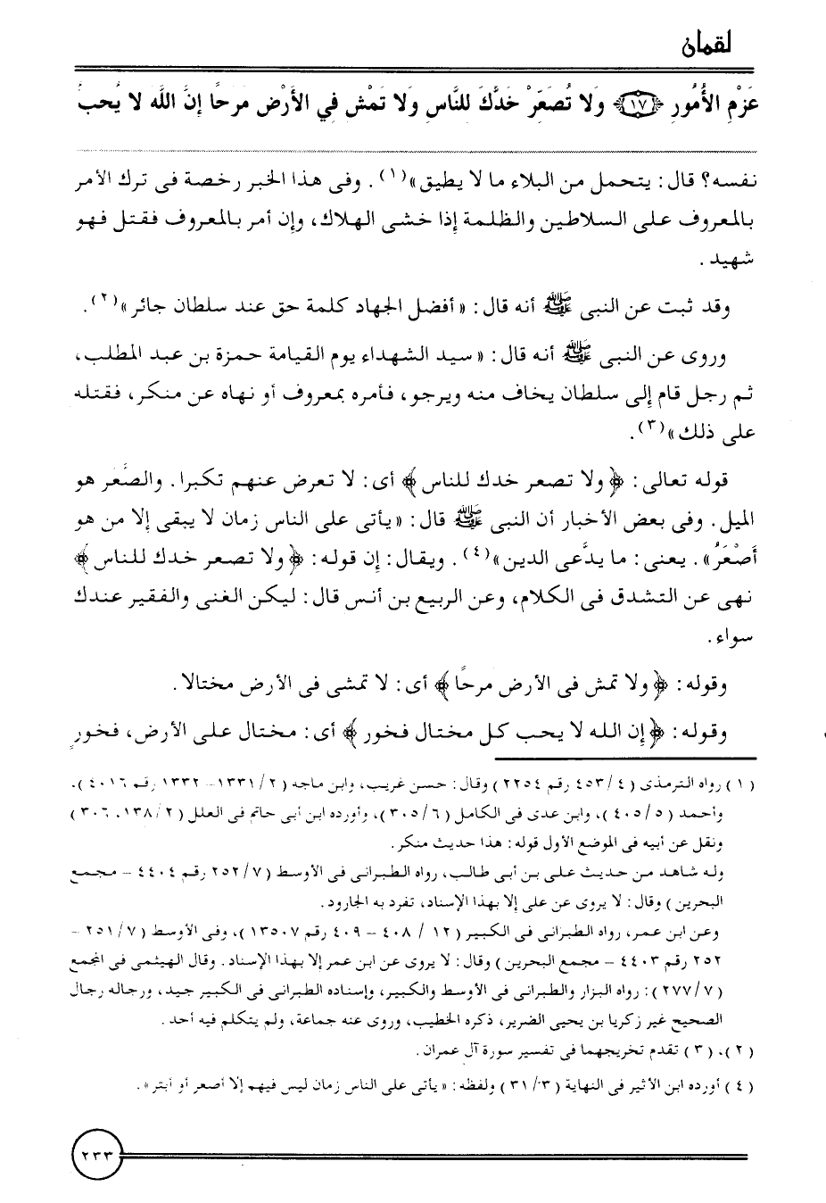 {عزم الْأُمُور (17) وَلَا تصعر خدك للنَّاس وَلَا تمش فِي الأَرْض مرحا إِن الله لَا يحب} نَفسه؟ قَالَ: يتَحَمَّل من الْبلَاء مَا لَا يُطيق ". وَفِي هَذَا الْخَبَر رخصَة فِي ترك الْأَمر بِالْمَعْرُوفِ على السلاطين والظلمة إِذا خشِي الْهَلَاك، وَإِن أَمر بِالْمَعْرُوفِ فَقتل فَهُوَ شَهِيد.