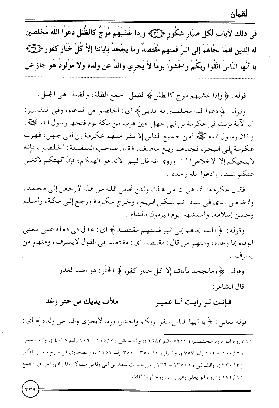 {فِي ذَلِك لآيَات لكل صبار شكور (31) وَإِذا غشيهم موج كالظلل دعوا الله مُخلصين لَهُ الدّين فَلَمَّا نجاهم إِلَى الْبر فَمنهمْ مقتصد وَمَا يجْحَد بِآيَاتِنَا إِلَّا كل ختار كفور (32) يَا أَيهَا النَّاس اتَّقوا ربكُم واخشوا يَوْمًا لَا يَجْزِي وَالِد عَن وَلَده وَلَا مَوْلُود هُوَ جَازَ عَن}