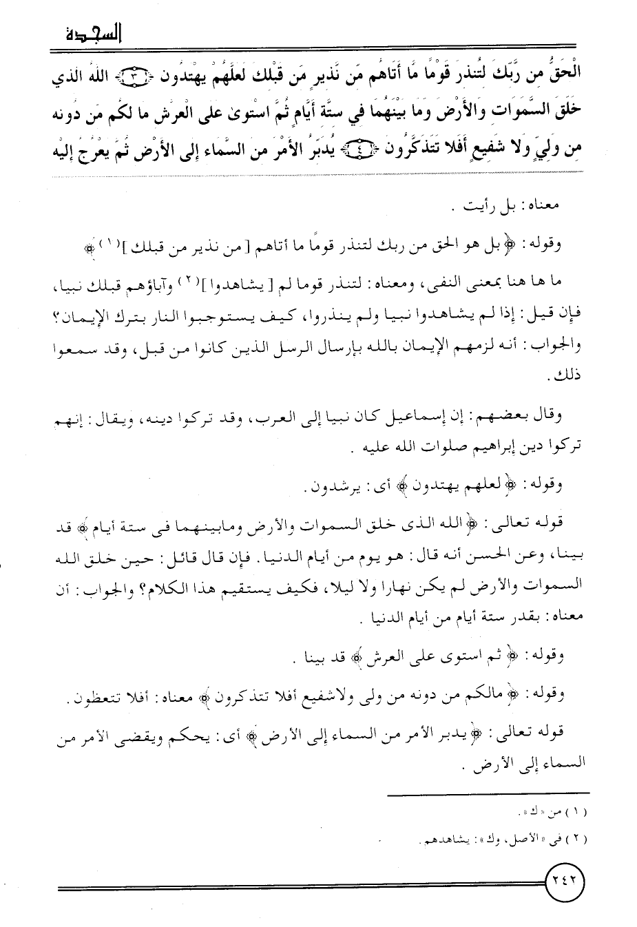 {الْحق من رَبك لتنذر قوما مَا أَتَاهُم من نَذِير من قبلك لَعَلَّهُم يَهْتَدُونَ (3) الله الَّذِي خلق السَّمَوَات وَالْأَرْض وَمَا بَينهمَا فِي سِتَّة أَيَّام ثمَّ اسْتَوَى على الْعَرْش مَا لكم من دونه من ولي وَلَا شَفِيع أَفلا تتذكرون (4) يدبر الْأَمر من السَّمَاء إِلَى الأَرْض ثمَّ يعرج إِلَيْهِ} مَعْنَاهُ: بل رَأَيْت.