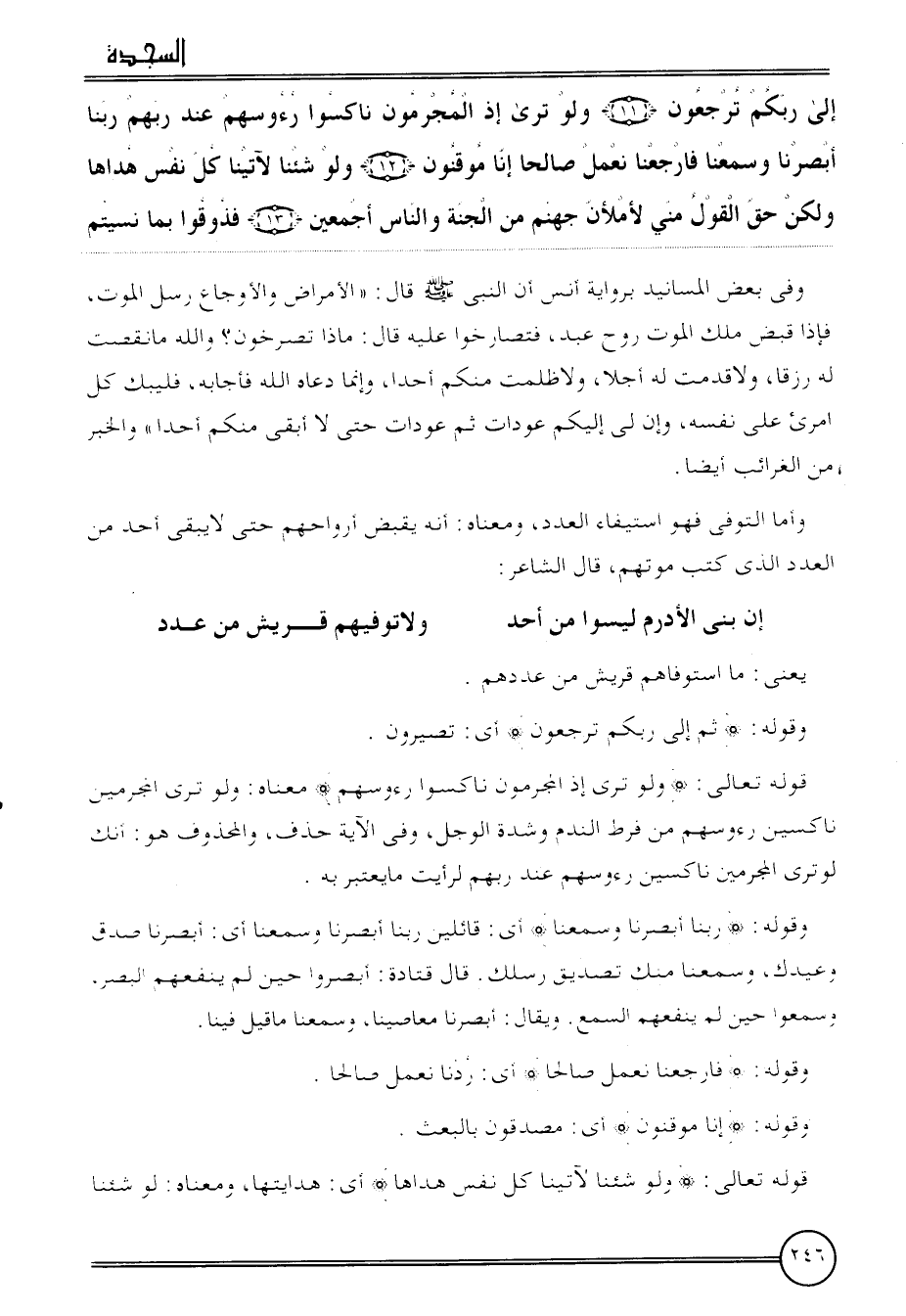 {إِلَى ربكُم ترجعون (11) وَلَو ترى إِذْ المجرمون ناكسوا رؤوسهم عِنْد رَبهم رَبنَا أبصرنا وَسَمعنَا فارجعنا نعمل صَالحا إِنَّا موقنون (12) وَلَو شِئْنَا لآتينا كل نفس هداها وَلَكِن حق القَوْل مني لأملأن جَهَنَّم من الْجنَّة وَالنَّاس أَجْمَعِينَ (13) فَذُوقُوا بِمَا نسيتم}