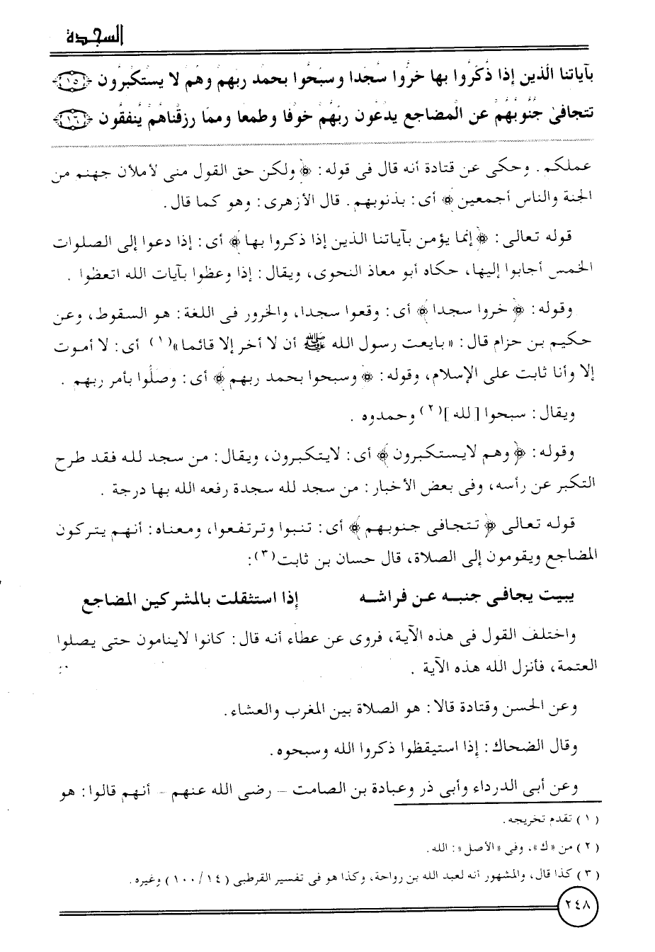 {بِآيَاتِنَا الَّذين إِذا ذكرُوا بهَا خروا سجدا وسبحوا بِحَمْد رَبهم وهم لَا يَسْتَكْبِرُونَ (15) تَتَجَافَى جنُوبهم عَن الْمضَاجِع يدعونَ رَبهم خوفًا وَطَمَعًا وَمِمَّا رَزَقْنَاهُمْ يُنْفقُونَ (16) } عَمَلكُمْ. وَحكى عَن قَتَادَة أَنه قَالَ فِي قَوْله: {وَلَكِن حق القَوْل مني لأملأن جَهَنَّم من الْجنَّة وَالنَّاس أَجْمَعِينَ} أَي: بِذُنُوبِهِمْ. قَالَ الْأَزْهَرِي: وَهُوَ كَمَا قَالَ.