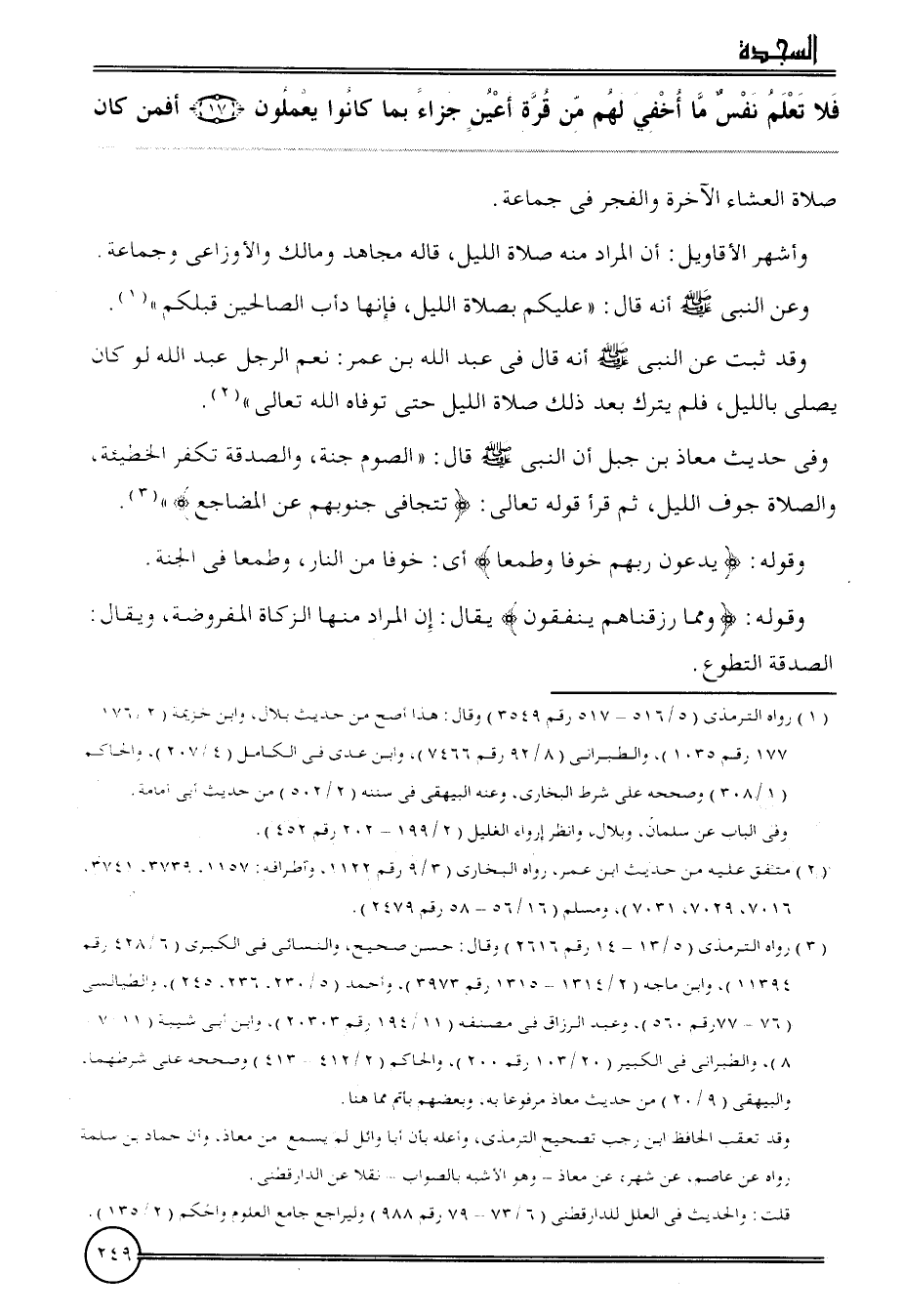 {فَلَا تعلم نفس مَا أُخْفِي لَهُم من قُرَّة أعين جَزَاء بِمَا كَانُوا يعْملُونَ (17) أَفَمَن كَانَ} صَلَاة الْعشَاء الْآخِرَة وَالْفَجْر فِي جمَاعَة.