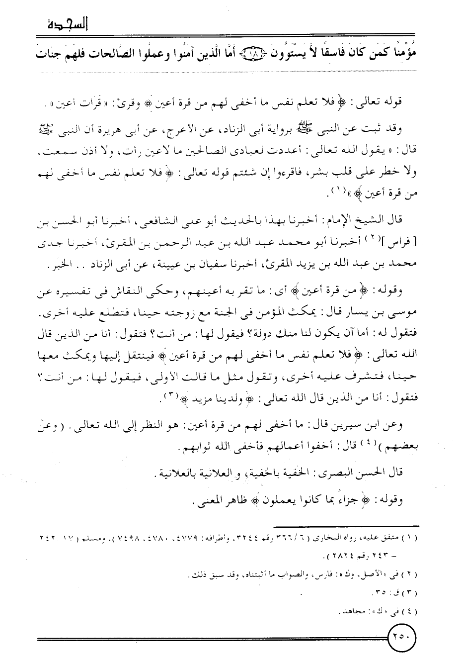 وَقد ثَبت عَن النَّبِي بِرِوَايَة أبي الزِّنَاد، عَن الْأَعْرَج، عَن ابي هُرَيْرَة أَن النَّبِي قَالَ: " يَقُول الله تَعَالَى: أَعدَدْت لعبادي الصَّالِحين مَا لَا عين رَأَتْ، وَلَا أذن سَمِعت، وَلَا خطر على قلب بشر، فاقرءوا إِن شِئْتُم قَوْله تَعَالَى: {فَلَا تعلم نفس مَا أُخْفِي لَهُم من قُرَّة أعين} ".