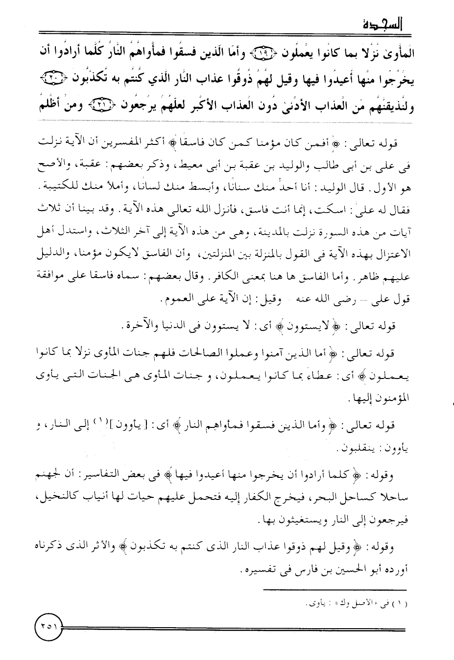 {المأوى نزلا بِمَا كَانُوا يعْملُونَ (19) وَأما الَّذين فسقوا فمأواهم النَّار كلما أَرَادوا أَن يخرجُوا مِنْهَا أعيدوا فِيهَا وَقيل لَهُم ذوقوا عَذَاب النَّار الَّذِي كُنْتُم بِهِ تكذبون (20) ولنذيقنهم من الْعَذَاب الْأَدْنَى دون الْعَذَاب الْأَكْبَر لَعَلَّهُم يرجعُونَ (21) وَمن أظلم}