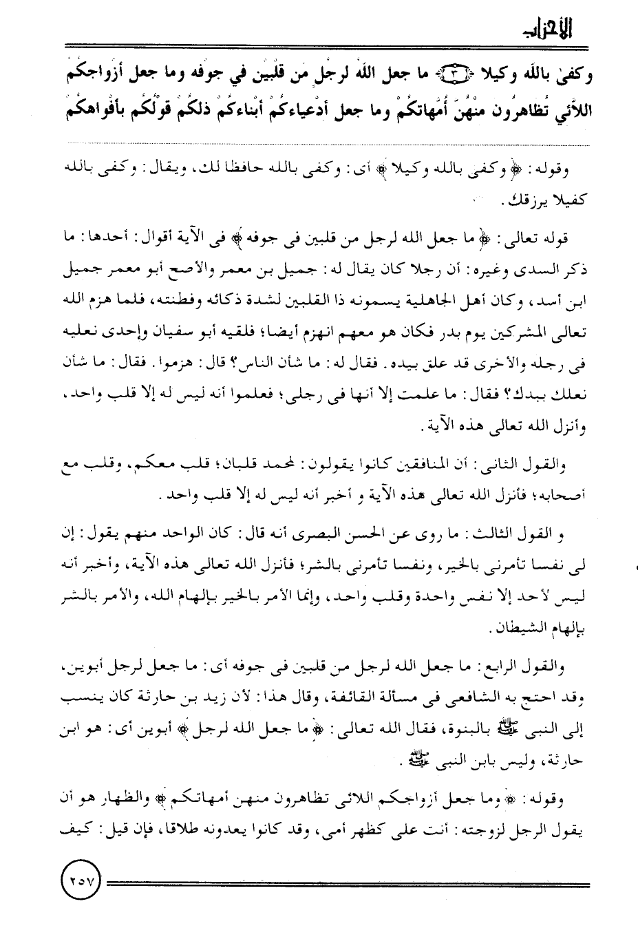 {وَكفى بِاللَّه وَكيلا (3) مَا جعل الله لرجل من قلبين فِي جَوْفه وَمَا جعل أزواجكم اللائي تظاهرون مِنْهُنَّ أُمَّهَاتكُم وَمَا جعل أدعياءكم أبناءكم ذَلِكُم قَوْلكُم بأفواهكم}