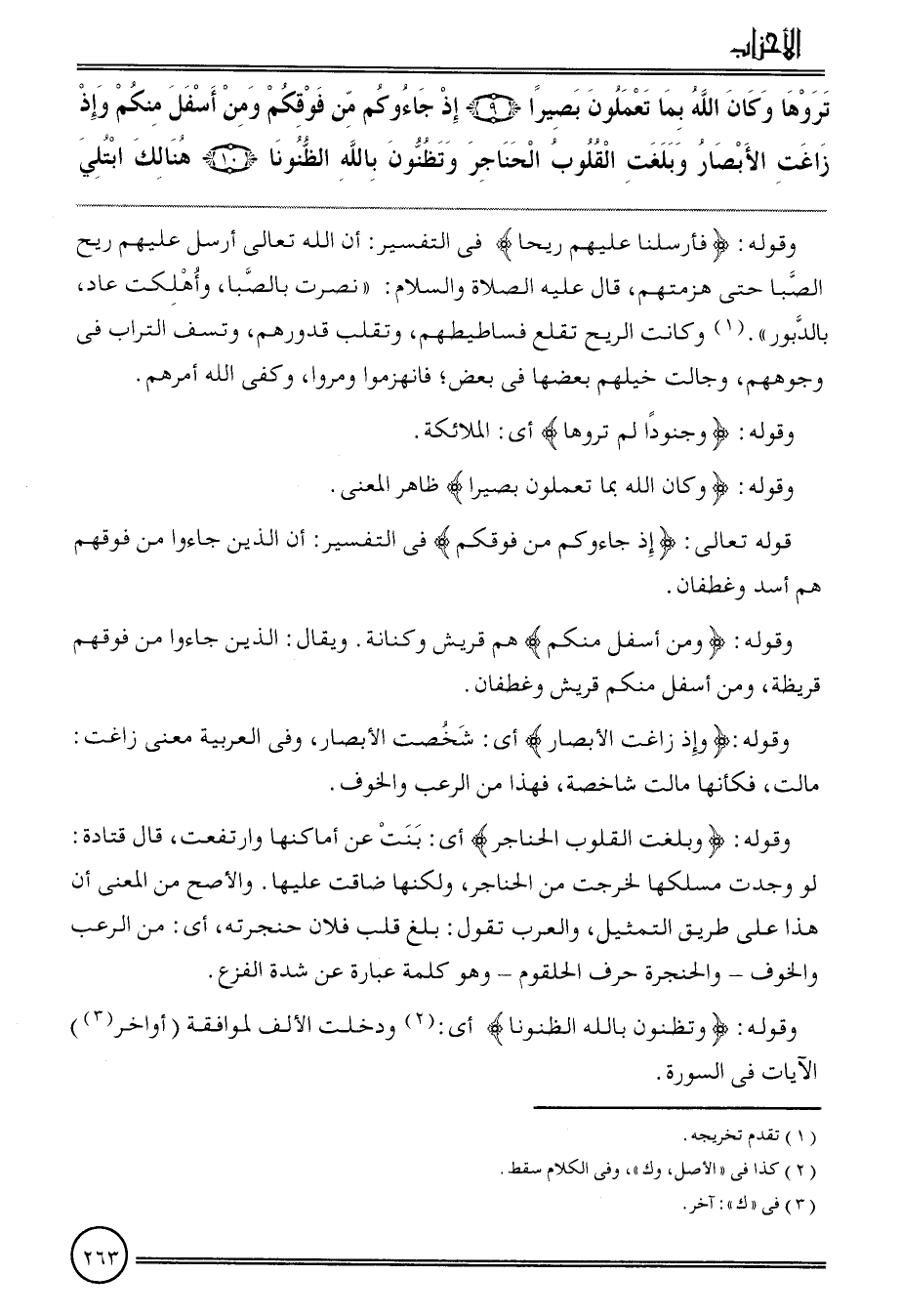 {تَرَوْهَا وَكَانَ الله بِمَا تَعْمَلُونَ بَصيرًا (9) إِذْ جاءوكم من فَوْقكُم وَمن أَسْفَل مِنْكُم وَإِذ زاغت الْأَبْصَار وَبَلغت الْقُلُوب الْحَنَاجِر وتظنون بِاللَّه الظنونا (10) هُنَالك ابْتُلِيَ}