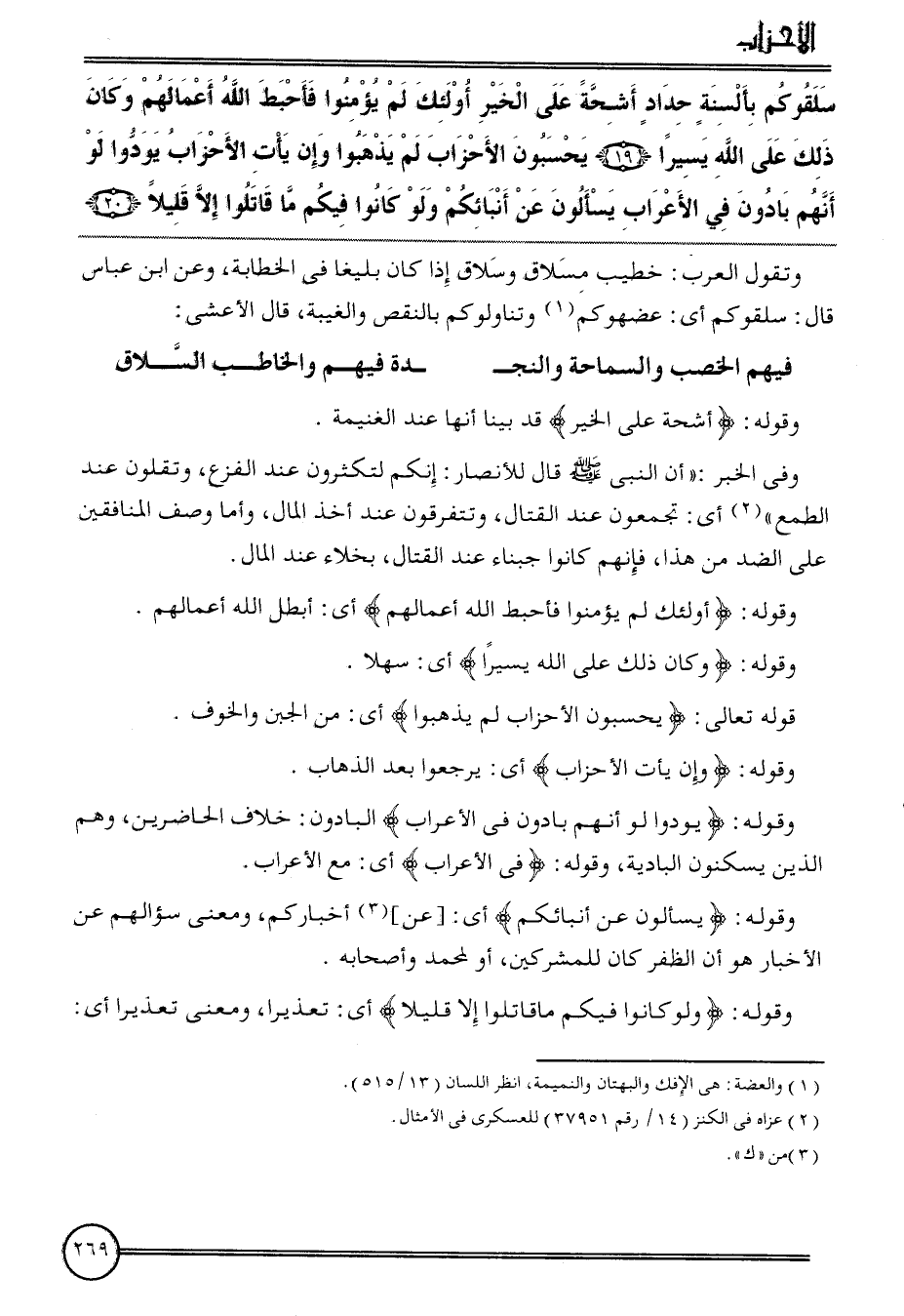{سلقوكم بألسنة حداد أشحة على الْخَيْر أُولَئِكَ لم يُؤمنُوا فأحبط الله أَعْمَالهم وَكَانَ ذَلِك على الله يَسِيرا (19) يحسبون الْأَحْزَاب لم يذهبوا وَإِن يَأْتِ الْأَحْزَاب يودوا لَو أَنهم بادون فِي الْأَعْرَاب يسْأَلُون عَن أنبائكم وَلَو كَانُوا فِيكُم مَا قَاتلُوا إِلَّا قَلِيلا (20)