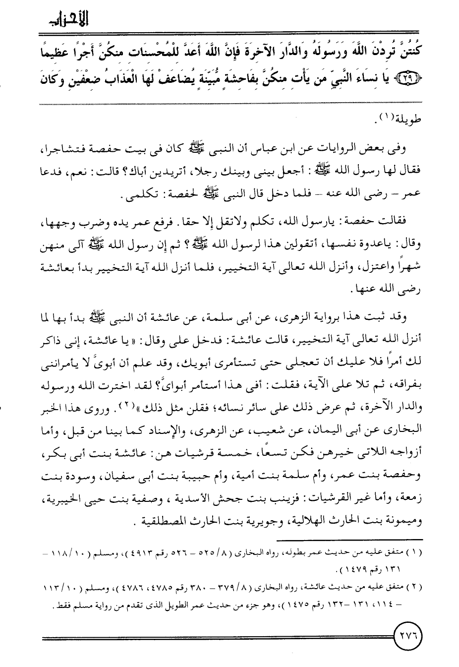 {كنتن تردن الله وَرَسُوله وَالدَّار الْآخِرَة فَإِن الله أعد للمحسنات مِنْكُن أجرا عَظِيما (29) يَا نسَاء النَّبِي من يَأْتِ مِنْكُن بِفَاحِشَة مبينَة يُضَاعف لَهَا الْعَذَاب ضعفين وَكَانَ} طَوِيلَة.