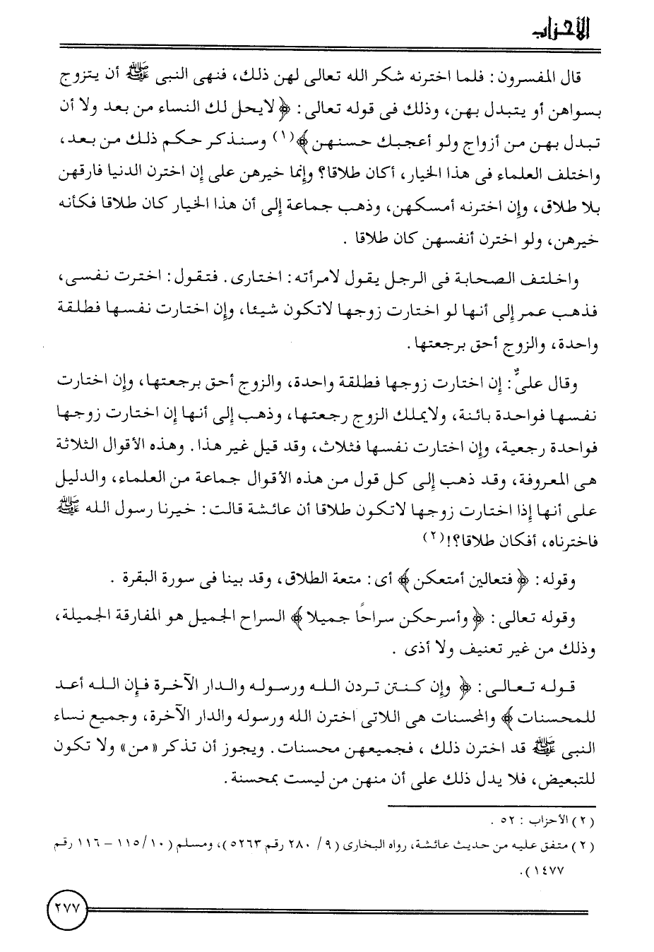 قَالَ الْمُفَسِّرُونَ: فَلَمَّا اخترنه شكر الله تَعَالَى لَهُنَّ ذَلِك، فَنهى النَّبِي أَن يتَزَوَّج بسواهن أَو يتبدل بِهن، وَذَلِكَ فِي قَوْله تَعَالَى: {لَا يحل لَك النِّسَاء من بعد وَلَا أَن تبدل بِهن من أَزوَاج وَلَو أعْجبك حسنهنَّ} وَسَنذكر حكم ذَلِك من بعد وَاخْتلف الْعلمَاء فِي هَذَا الْخِيَار، أَكَانَ طَلَاقا؟ وَإِنَّمَا خيرهن على إِن اخْترْنَ الدُّنْيَا فارقهن بِلَا طَلَاق، وَإِن اخترنه أمسكهن، وَذهب جمَاعَة إِلَى أَن هَذَا الْخِيَار كَانَ طَلَاقا فَكَأَنَّهُ خيرهن، وَلَو اخْترْنَ أَنْفسهنَّ كَانَ طَلَاقا.