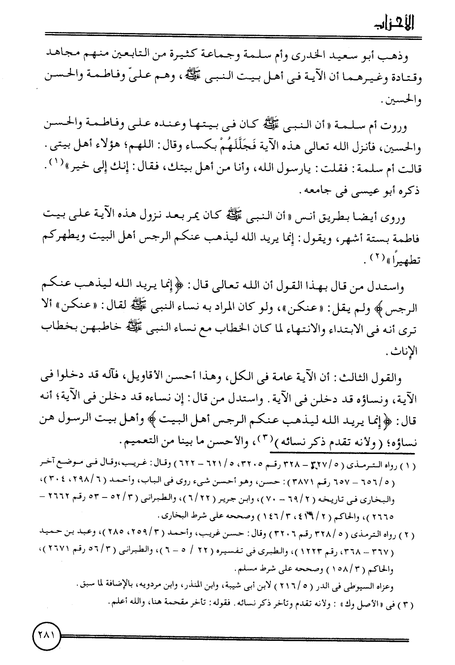 وَالْقَوْل الثَّالِث: أَن الْآيَة عَامَّة فِي الْكل، وَهَذَا أحسن الْأَقَاوِيل، فآله قد دخلُوا فِي الْآيَة، ونساؤه قد دخلن فِي الْآيَة. وَاسْتدلَّ من قَالَ: إِن نِسَاءَهُ قد دخلن فِي الْآيَة؛ أَنه قَالَ: {إِنَّمَا يُرِيد الله ليذْهب عَنْكُم الرجس أهل الْبَيْت} وَأهل بَيت الرَّسُول هن نِسَاءَهُ؛ (وَلِأَنَّهُ تقدم ذكر نِسَائِهِ) ، وَالْأَحْسَن مَا بَينا من التَّعْمِيم.