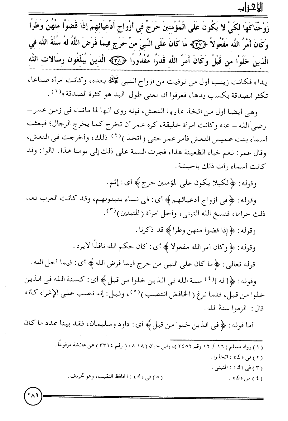 {زَوَّجْنَاكهَا لكَي لَا يكون على الْمُؤمنِينَ حرج فِي أَزوَاج أدعيائهم إِذا قضوا مِنْهُنَّ وطرا وَكَانَ أَمر الله مَفْعُولا (37) مَا كَانَ على النَّبِي من حرج فِيمَا فرض الله لَهُ سنة الله فِي الَّذين خلوا من قبل وَكَانَ أَمر الله قدرا مَقْدُورًا (38) الَّذين يبلغون رسالات الله} يدا " فَكَانَت زَيْنَب أول من توفيت من أَزوَاج النَّبِي بعده، وَكَانَت امْرَأَة صناعًا، تكْثر الصَّدَقَة بكسب يَدهَا، فعرفوا أَن معنى طول الْيَد هُوَ كَثْرَة الصَّدَقَة ".