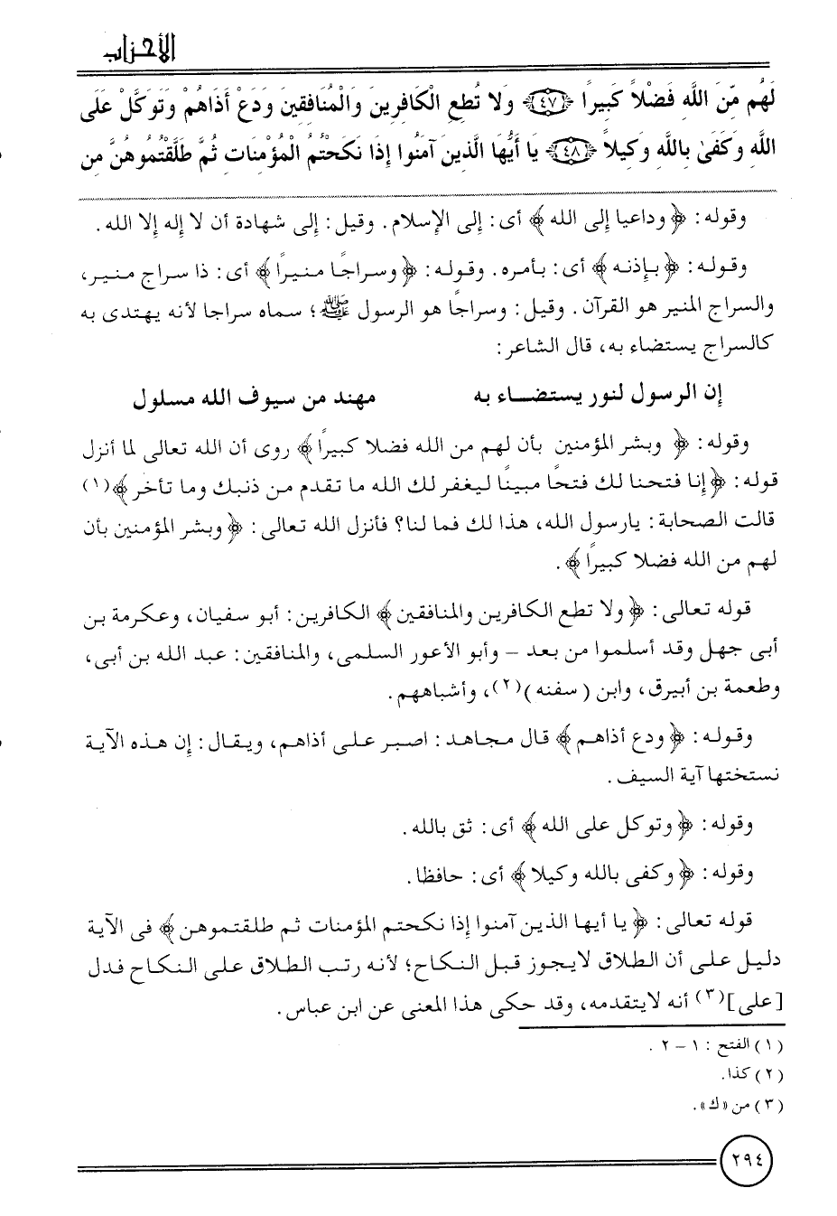 {لَهُم من الله فضلا كَبِيرا (47) وَلَا تُطِع الْكَافرين وَالْمُنَافِقِينَ ودع أذاهم وتوكل على الله وَكفى بِاللَّه وَكيلا (48) يَا أَيهَا الَّذين آمنُوا إِذا نكحتم الْمُؤْمِنَات ثمَّ طلقتموهن من}