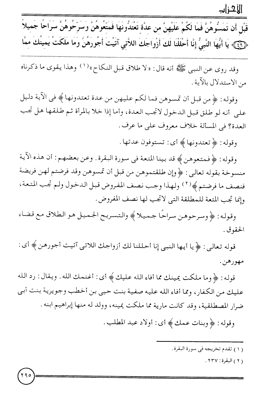{قبل أَن تمَسُّوهُنَّ فَمَا لكم عَلَيْهِنَّ من عدَّة تعتدونها فمتعوهن وسرحوهن سراحا جميلا (49) يَا أَيهَا النَّبِي إِنَّا أَحللنَا لَك أَزوَاجك اللَّاتِي آتيت أُجُورهنَّ وَمَا ملكت يَمِينك مِمَّا}