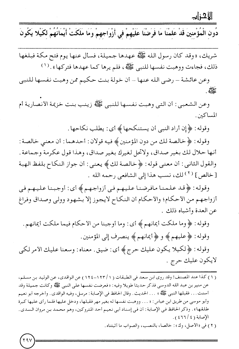 وَقَوله: {خَالِصَة لَك من دون الْمُؤمنِينَ} فِيهِ قَولَانِ: أَحدهمَا: أَن معني خَالِصَة: أَنَّهَا حَلَال لَك بِغَيْر صدَاق، وَلَا تحل لغيرك بِغَيْر صدَاق، وَهَذَا قَول عِكْرِمَة وَجَمَاعَة. وَالْقَوْل الثَّانِي: أَن معنى قَوْله: {خَالِصَة لَك} يَعْنِي: أَن جَوَاز النِّكَاح بِلَفْظ الْهِبَة [خَالص] لَك، نسب هَذَا إِلَى الشَّافِعِي رَحمَه الله.