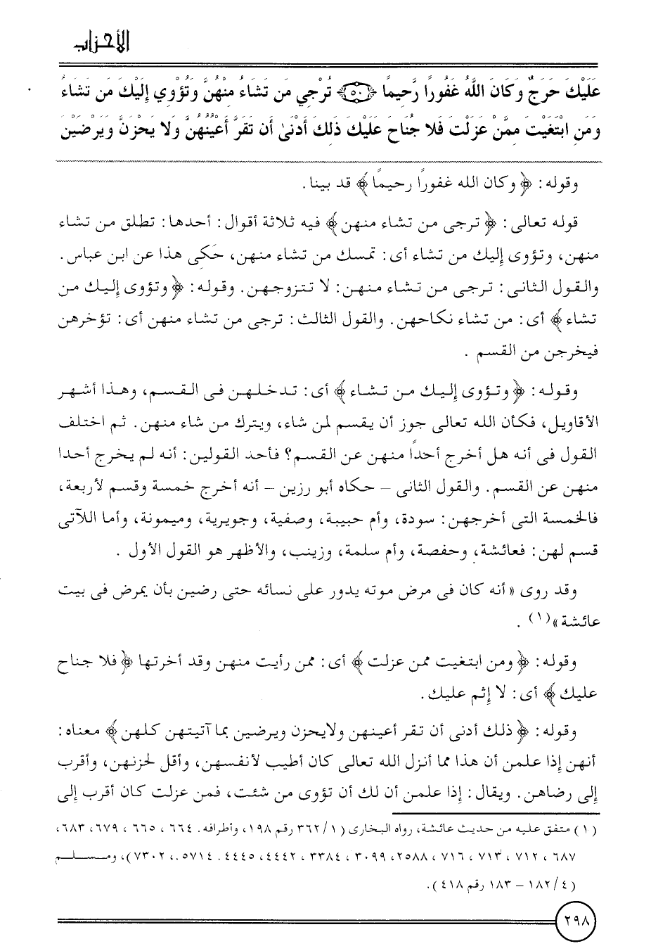 قَوْله تَعَالَى: {ترجى من تشَاء مِنْهُنَّ} فِيهِ ثَلَاثَة أَقْوَال: أَحدهَا: تطلق من تشَاء مِنْهُنَّ، وَتُؤْوِي إِلَيْك من تشَاء أَي: تمسك من تشَاء مِنْهُنَّ، حُكيَ هَذَا عَن ابْن عَبَّاس. وَالْقَوْل الثَّانِي: ترجى من تشَاء مِنْهُنَّ: لَا تتزوجهن. وَقَوله: {وتؤوى إِلَيْك من تشَاء} أى: من تشَاء نِكَاحهنَّ. وَالْقَوْل الثَّالِث: ترجى من تشَاء مِنْهُنَّ أَي: تؤخرهن فيخرجن من الْقسم.