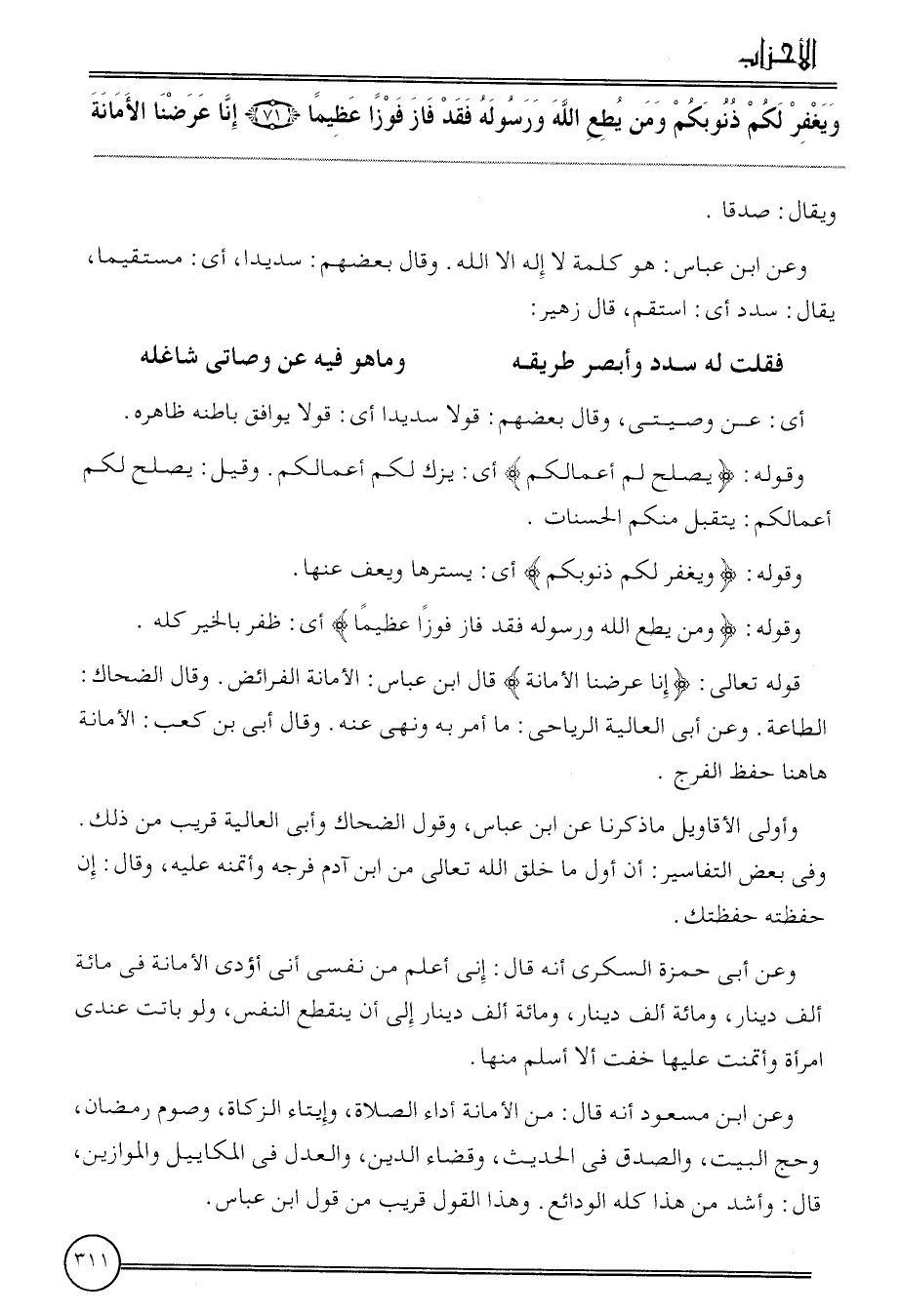{وَيغْفر لكم ذنوبكم وَمن يطع الله وَرَسُوله فقد فَازَ فوزا عَظِيما (71) إِنَّا عرضنَا الْأَمَانَة} وَيُقَال: صدقا.