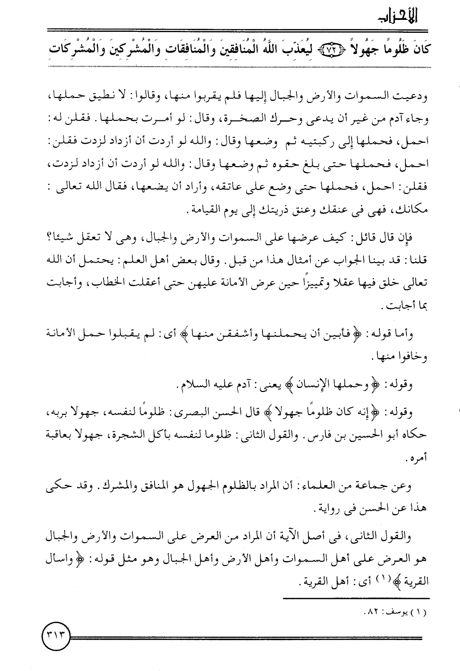 {كَانَ ظلوما جهولا (72) ليعذب الله الْمُنَافِقين والمنافقات وَالْمُشْرِكين والمشركات} ودعيت السَّمَوَات وَالْأَرْض وَالْجِبَال إِلَيْهَا فَلم يقربُوا مِنْهَا، وَقَالُوا: لَا نطيق حملهَا، وَجَاء آدم من غير أَن يَدعِي وحرك الصَّخْرَة، وَقَالَ: لَو أمرت بحملها. فَقُلْنَ لَهُ: احْمِلْ، فحملها إِلَى رُكْبَتَيْهِ ثمَّ وَضعهَا وَقَالَ: وَالله لَو أردْت أَن أزداد لزدت فَقُلْنَ: احْمِلْ، فحملها حَتَّى بلغ حقوه ثمَّ وَضعهَا وَقَالَ: وَالله لَو أردْت أَن أزداد لزدت، فَقُلْنَ: احْمِلْ، فحملها حَتَّى وضع على عَاتِقه، وَأَرَادَ أَن يَضَعهَا، فَقَالَ الله تَعَالَى: مَكَانك، فَهِيَ فِي عُنُقك وعنق ذريتك إِلَى يَوْم الْقِيَامَة.