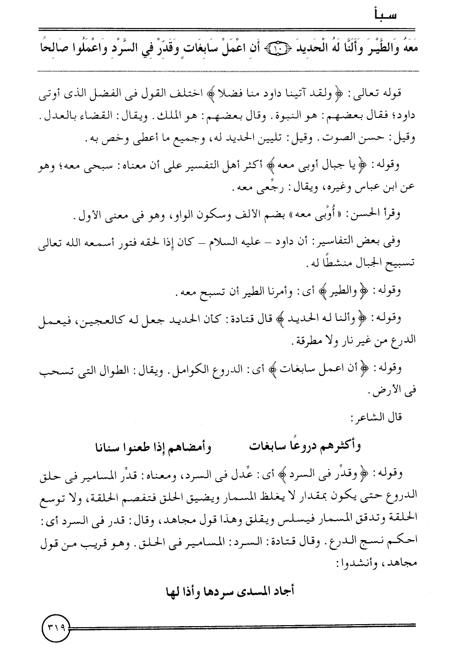 وَقَوله: {وَقدر فِي السرد} أَي: عدل فِي السرد، وَمَعْنَاهُ: قدر المسامير فِي حلق الدروع حَتَّى يكون بِمِقْدَار لَا يغلظ المسمار ويضيق الْخلق فتفصم الْحلقَة، وَلَا توسع الْحلقَة وتدقق المسمار فيسلس ويقلق وَهَذَا قَول مُجَاهِد، وَقَالَ: قدر فِي السرد أَي: احكم نسج الدرْع. وَقَالَ قَتَادَة: السرد: المسامير فِي الْحلق. وَهُوَ قريب من قَول مُجَاهِد، وأنشدوا: