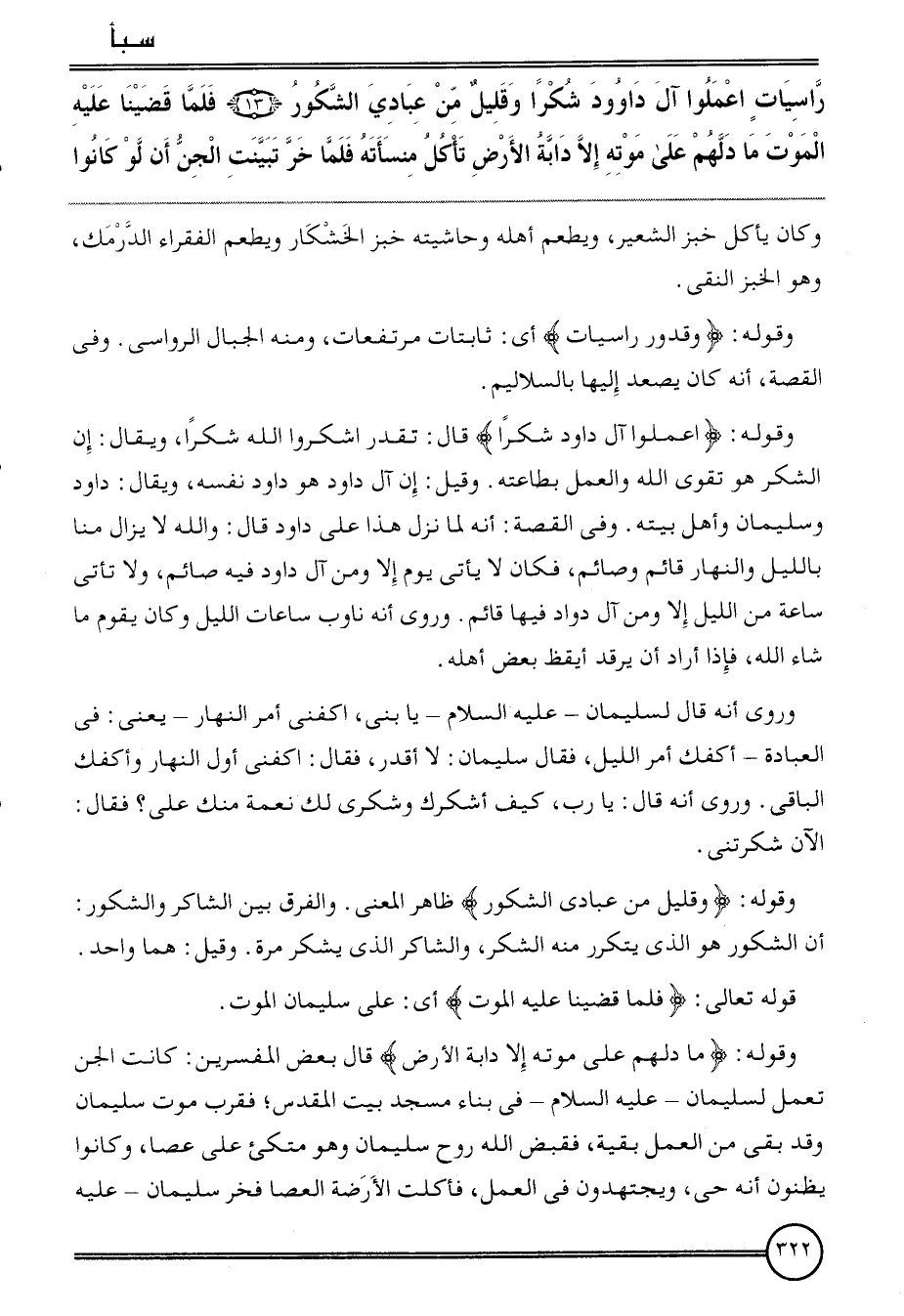 وَقَوله: {اعْمَلُوا آل دَاوُد شكرا} قَالَ: تقدر اشكروا الله شكرا، وَيُقَال: إِن الشُّكْر هُوَ تقوى الله وَالْعَمَل بِطَاعَتِهِ. وَقيل: إِن آل دَاوُد هُوَ دَاوُد نَفسه، وَيُقَال: دَاوُد وَسليمَان وَأهل بَيته. وَفِي الْقِصَّة: أَنه لما نزل هَذَا على دَاوُد قَالَ: وَالله لَا يزَال منا بِاللَّيْلِ وَالنَّهَار قَائِم وصائم، فَكَانَ لَا يَأْتِي يَوْم إِلَّا وَمن آل دَاوُد فِيهِ صَائِم، وَلَا تَأتي سَاعَة من اللَّيْل إِلَّا وَمن آل دَاوُد فِيهَا قَائِم. وروى أَنه ناوب سَاعَات اللَّيْل وَكَانَ يقوم مَا شَاءَ الله، فَإِذا أَرَادَ أَن يرقد أيقظ بعض أَهله.