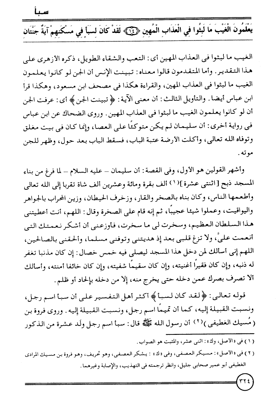 {يعلمُونَ الْغَيْب مَا لَبِثُوا فِي الْعَذَاب المهين (14) لقد كَانَ لسبأ فِي مسكنهم آيَة جنتان} الْغَيْب مَا لَبِثُوا فِي الْعَذَاب المهين أَي: التَّعَب والشقاء الطَّوِيل، ذكره الْأَزْهَرِي على هَذَا التَّقْرِير. وَأما المتقدمون قَالُوا مَعْنَاهُ: تبينت الْإِنْس أَن الْجِنّ لَو كَانُوا يعلمُونَ الْغَيْب مَا لَبِثُوا فِي الْعَذَاب المهين، وَالْقِرَاءَة هَكَذَا فِي مصحف ابْن مَسْعُود، وَهَكَذَا قَرَأَ ابْن عَبَّاس أَيْضا. والتأويل الثَّالِث: أَن، معنى الْآيَة: {تبينت الْجِنّ} أَي: عرفت الْجِنّ أَن لَو كَانُوا يعلمُونَ الْغَيْب مَا لَبِثُوا فِي الْعَذَاب المهين. وروى الضَّحَّاك عَن ابْن عَبَّاس فِي رِوَايَة أُخْرَى: أَن سُلَيْمَان لم يكن متوكئا على الْعَصَا، وَإِنَّمَا كَانَ فِي بَيت مغلق وتوفاه الله تَعَالَى، وأكلت الأرضة عتبَة الْبَاب، فَسقط الْبَاب بعد حول، وَظهر للجن مَوته.