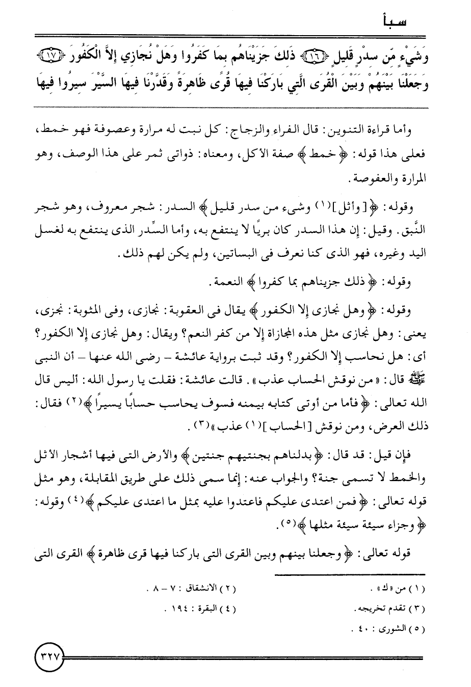 {وَشَيْء من سدر قَلِيل (16) ذَلِك جريناهم بِمَا كفرُوا وَهل نجازي إِلَّا الكفور (17) وَجَعَلنَا بَينهم وَبَين الْقرى الَّتِي باركنا فِيهَا قرى ظَاهِرَة وقدرنا فِيهَا السّير سِيرُوا فِيهَا}