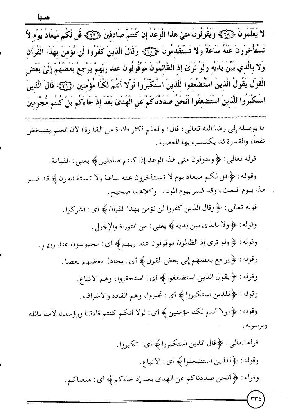 {لَا يعلمُونَ (28) وَيَقُولُونَ مَتى هَذَا الْوَعْد إِن كُنْتُم صَادِقين (29) قل لكم ميعاد يَوْمًا لَا تستأخرون عَنهُ سَاعَة وَلَا تستقدمون (30) وَقَالَ الَّذين كفرُوا لن نؤمن بِهَذَا الْقُرْآن وَلَا بِالَّذِي بَين يَدَيْهِ وَلَو ترى إِذْ الظَّالِمُونَ موقوفون عِنْد رَبهم يرجع بَعضهم إِلَى بعض القَوْل يَقُول الَّذين استضعفوا للَّذين استكبروا لَوْلَا أَنْتُم لَكنا مُؤمنين (31) قَالَ الَّذين استكبروا للَّذين استضعفوا أَنَحْنُ صددناكم عَن الْهدى بعد إِذْ جَاءَكُم بل كُنْتُم مجرمين} مَا يوصله إِلَى رضَا الله تَعَالَى، قَالَ: وَالْعلم أَكثر فَائِدَة من الْقُدْرَة؛ لِأَن الْعلم يتمخض نفعا، وَالْقُدْرَة قد يكْتَسب بهَا الْمعْصِيَة.