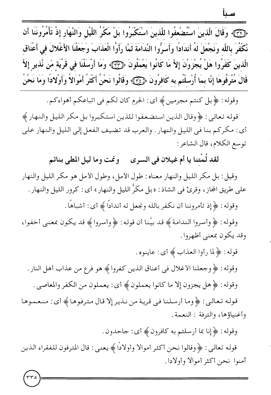 ( {32) وَقَالَ الَّذين استضعفوا للَّذين استكبروا بل مكر اللَّيْل وَالنَّهَار إِذْ تأمروننا أَن نكفر بِاللَّه ونجعل لَهُ أندادا وأسروا الندامة لما رَأَوْا الْعَذَاب وَجَعَلنَا الأغلال فِي أَعْنَاق الَّذين كفرُوا هَل يجزون إِلَّا مَا كَانُوا يعْملُونَ (33) وَمَا أرسلنَا فِي قَرْيَة من نَذِير إِلَّا قَالَ مترفوها إِنَّا بِمَا أرسلتم بِهِ كافرون (34) وَقَالُوا نَحن أَكثر أَمْوَالًا وأولادا وَمَا نَحن}