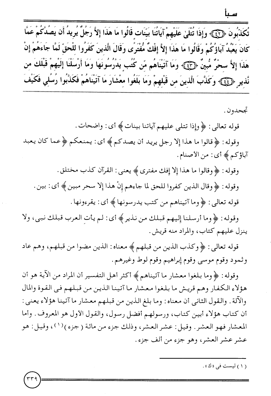 {تكذبون (42) وَإِذ تتلى عَلَيْهِم آيَاتنَا بَيِّنَات قَالُوا مَا هَذَا إِلَّا رجل يُرِيد أَن يصدكم عَمَّا كَانَ يعبد آباؤكم وَقَالُوا مَا هَذَا إِلَّا إفْك مفترى وَقَالَ الَّذين كفرُوا للحق لما جَاءَهُم إِن هَذَا إِلَّا سحر مُبين (43) وَمَا آتَيْنَاهُم من كتب يدرسونها وَمَا أرسلنَا إِلَيْهِم قبلك من نَذِير (44) وَكذب الَّذين من قبلهم وَمَا بلغُوا معشار مَا آتَيْنَاهُم فكذبوا رُسُلِي فَكيف} تجحدون.