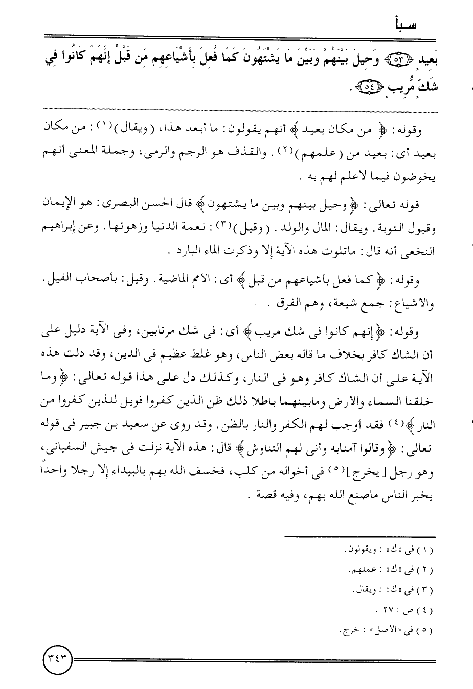 وَقَوله: {إِنَّهُم كَانُوا فِي شكّ مريب} أَي: فِي شكّ مرتابين، وَفِي الْآيَة دَلِيل على أَن الشاك كَافِر بِخِلَاف مَا قَالَه بعض النَّاس، وَهُوَ غلط عَظِيم فِي الدّين، وَقد دلّت هَذِه الْآيَة على أَن الشاك كَافِر وَهُوَ فِي النَّار، وَكَذَلِكَ دلّ على هَذَا قَوْله تَعَالَى: {وَمَا خلقنَا السَّمَاء وَالْأَرْض وَمَا بَينهمَا بَاطِلا ذَلِك ظن الَّذين كفرُوا فويل للَّذين كفرُوا من النَّار} فقد أوجب لَهُم الْكفْر وَالنَّار بِالظَّنِّ. وَقد رُوِيَ عَن سعيد بن جُبَير فِي قَوْله تَعَالَى: {وَقَالُوا آمنا بِهِ وأنى لَهُم التناوش} قَالَ: هَذِه الْآيَة نزلت فِي جَيش السفياني، وَهُوَ رجل [يخرج] فِي أَخْوَاله من كلب، فَخسفَ الله بهم بِالْبَيْدَاءِ إِلَّا رجلا وَاحِدًا يخبر النَّاس مَا صنع الله بهم، وَفِيه قصَّة.